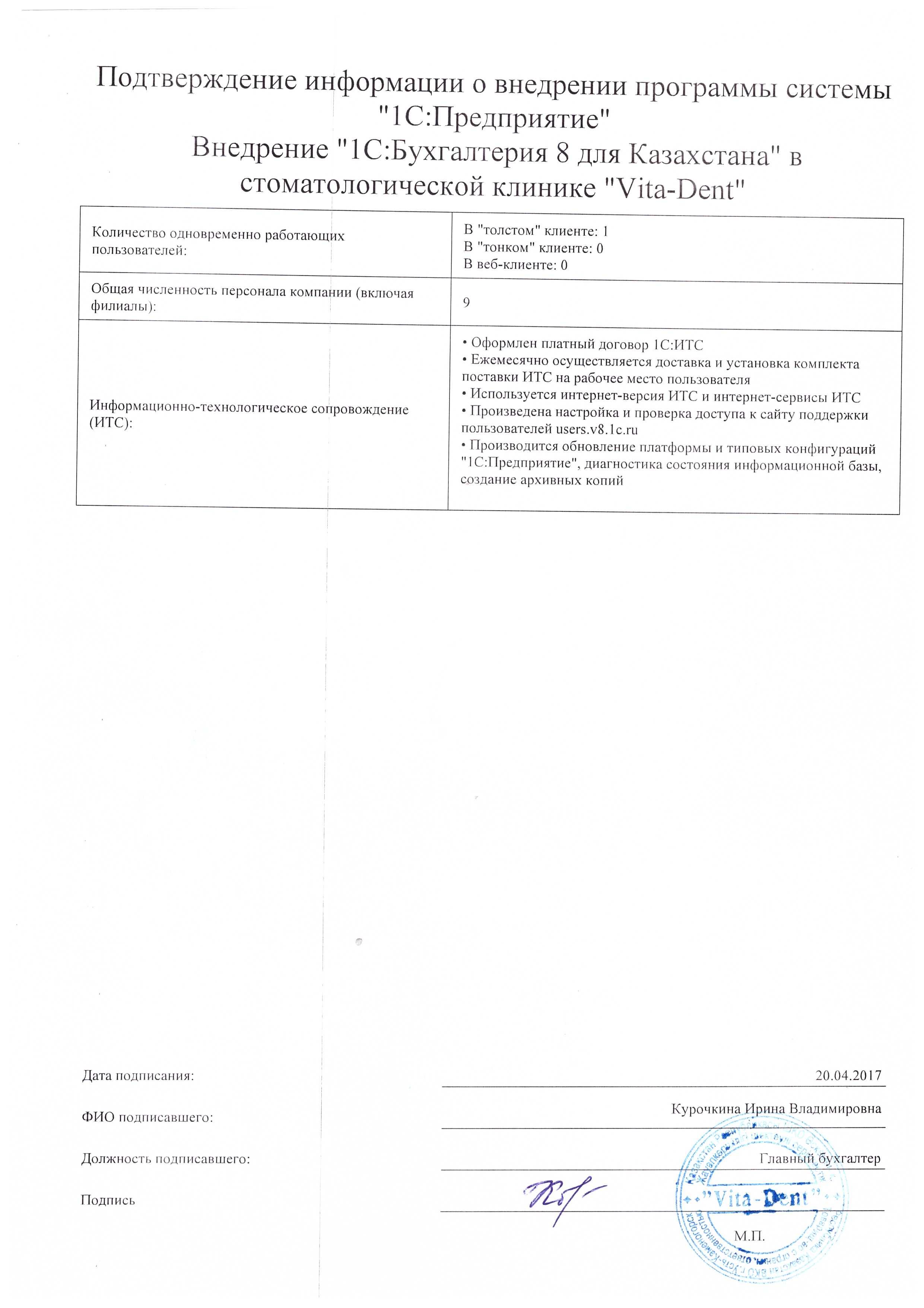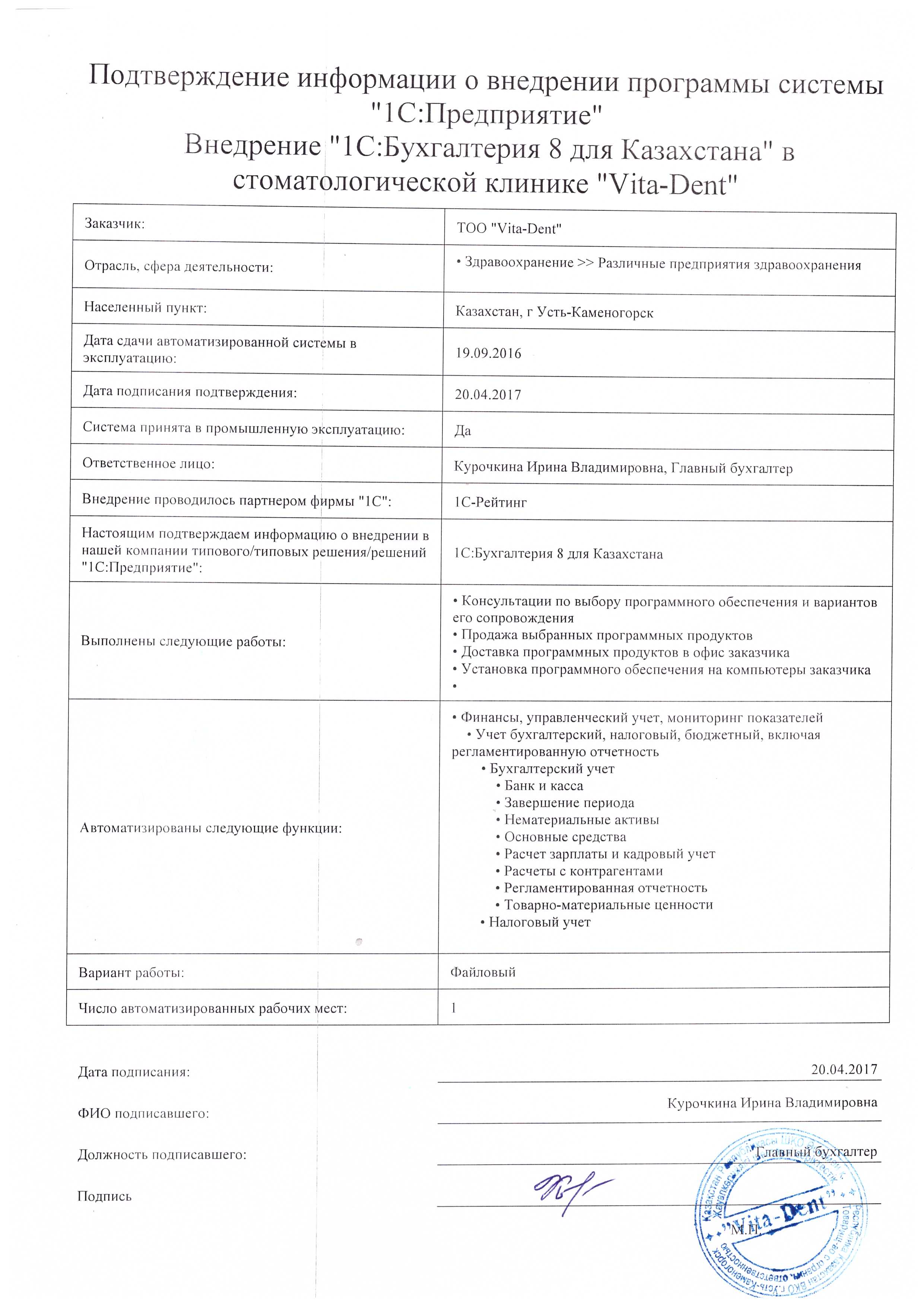 | Внедренное типовое решение: | 1С:Бухгалтерия 8 для Казахстана |