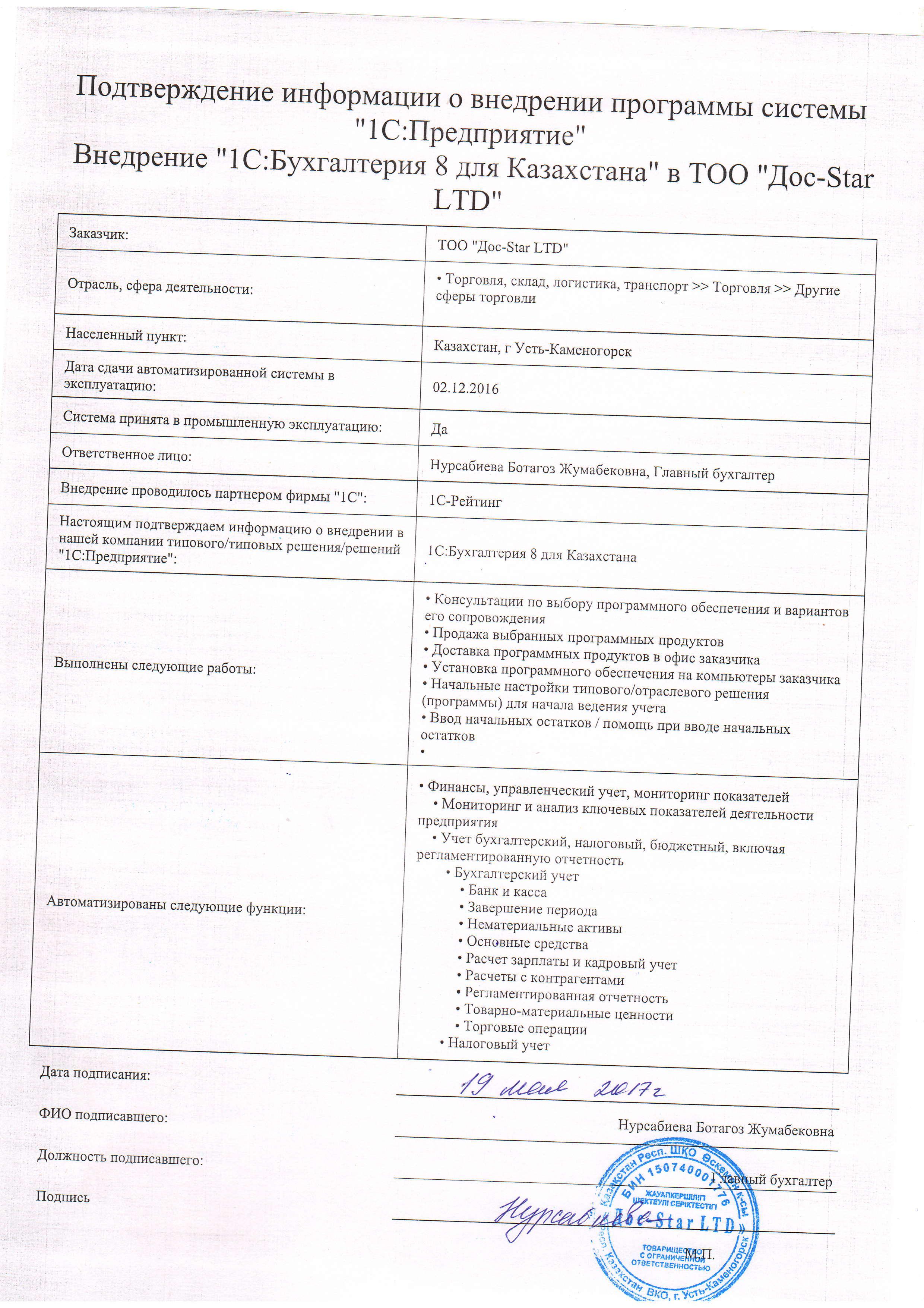 | Внедренное типовое решение: | 1С:Бухгалтерия 8 для Казахстана |