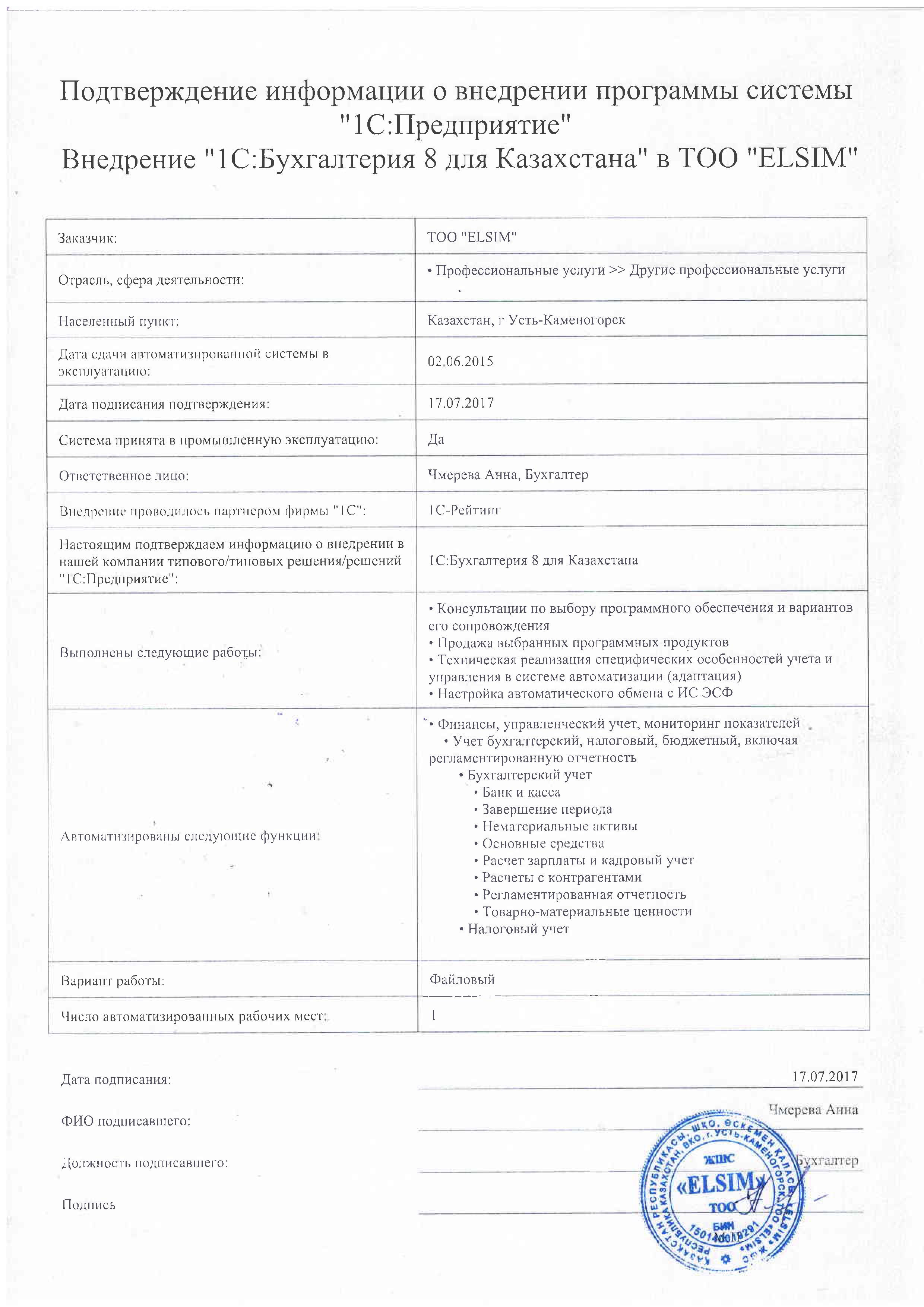 | Внедренное типовое решение: | 1С:Бухгалтерия 8 для Казахстана |