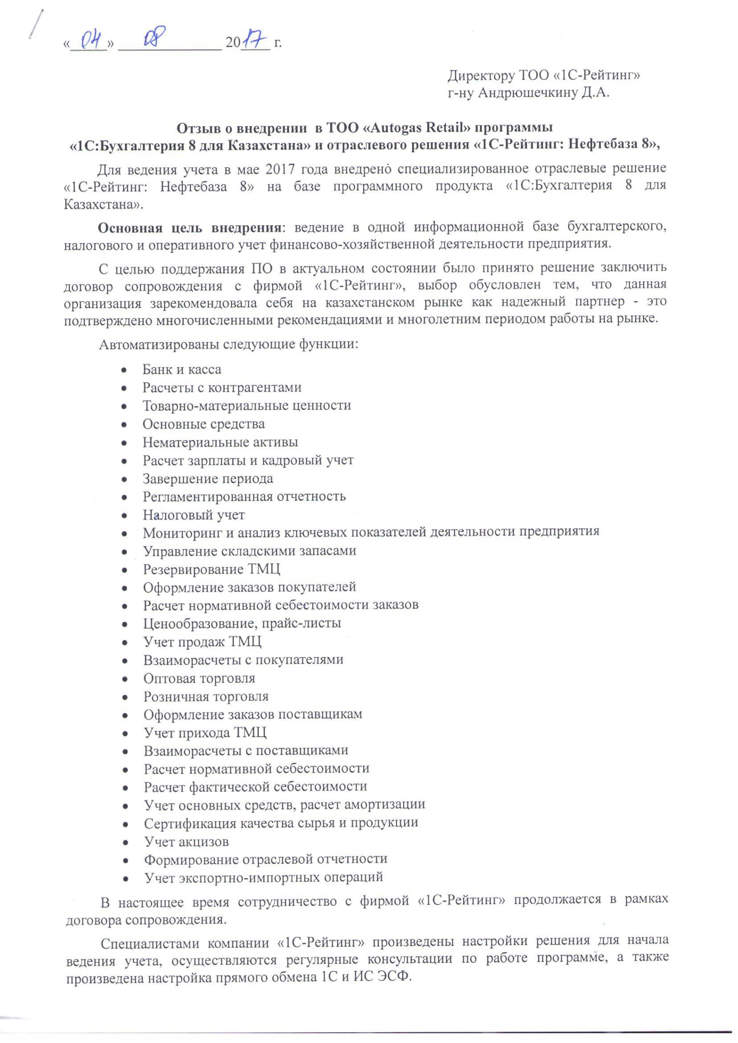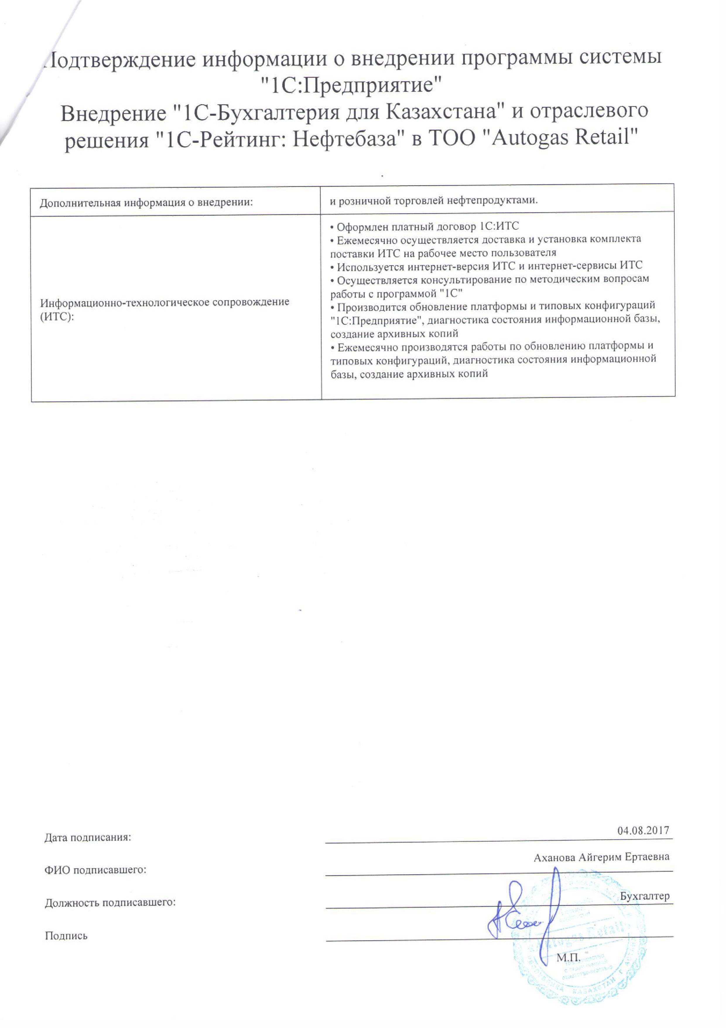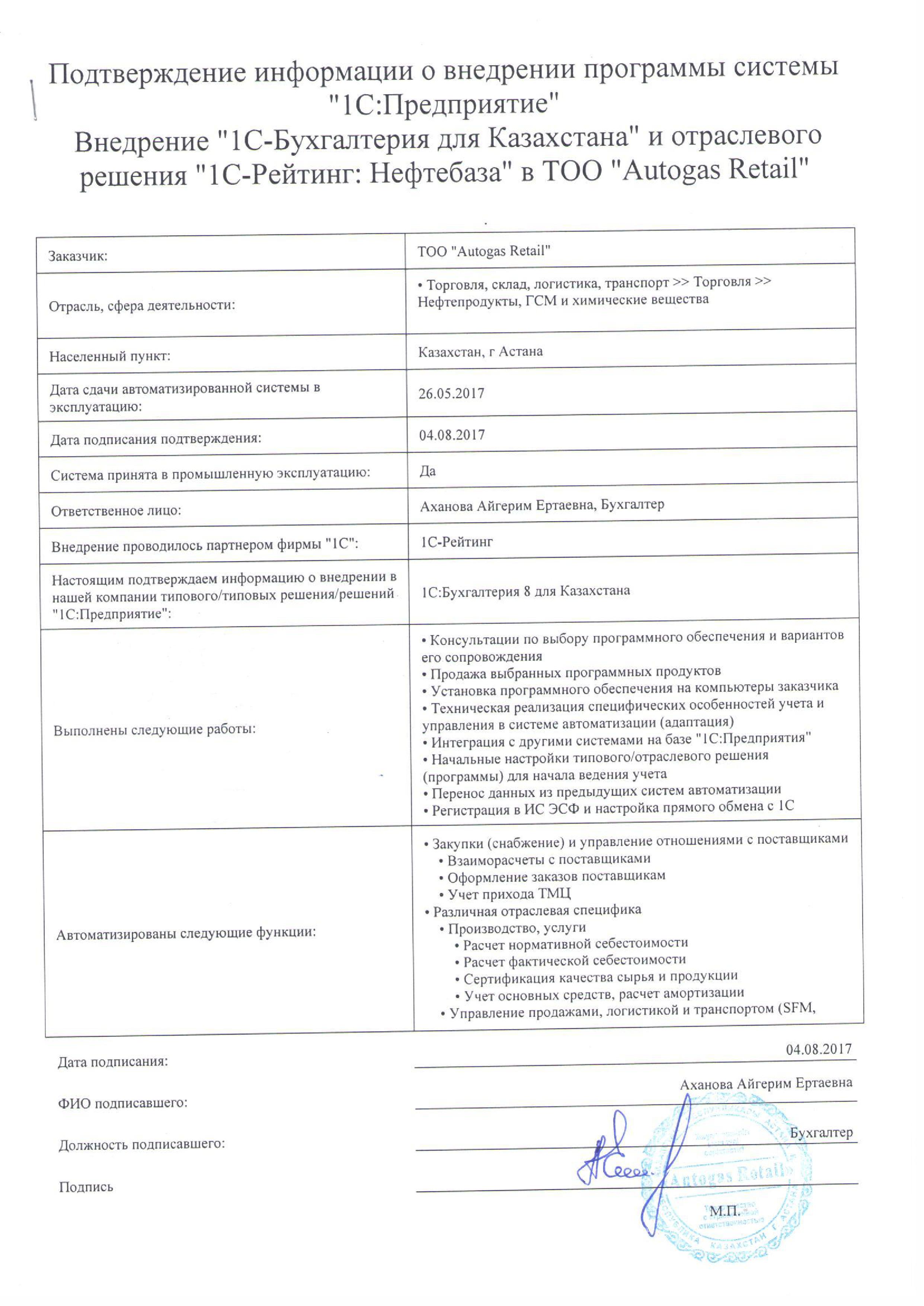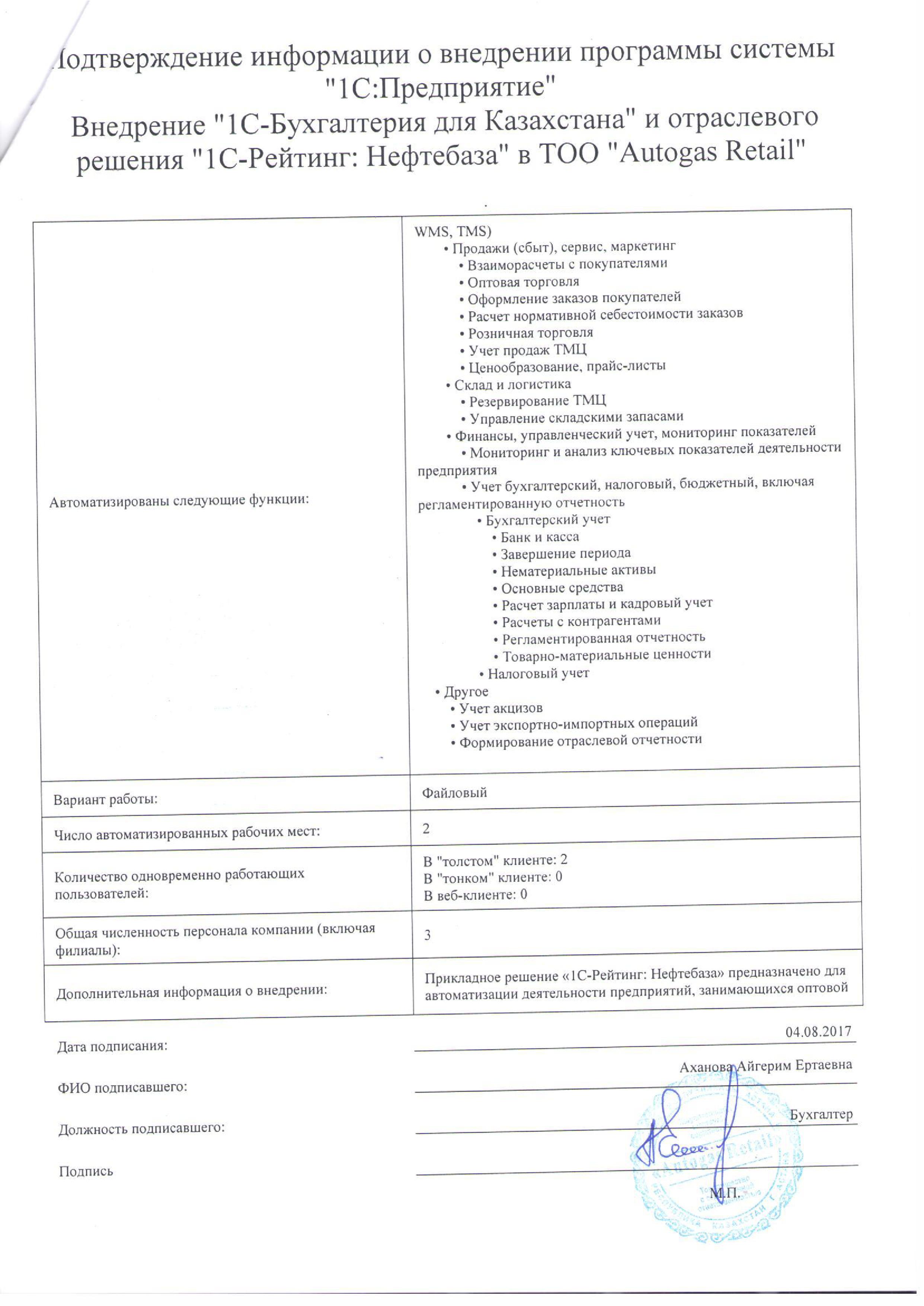 | Внедренное типовое решение: | 1С:Бухгалтерия 8 для Казахстана |