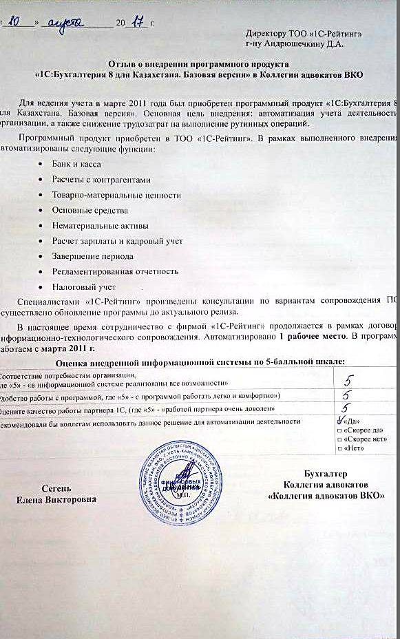 - Осуществляется консультирование по методическим вопросам работы с программой 1С