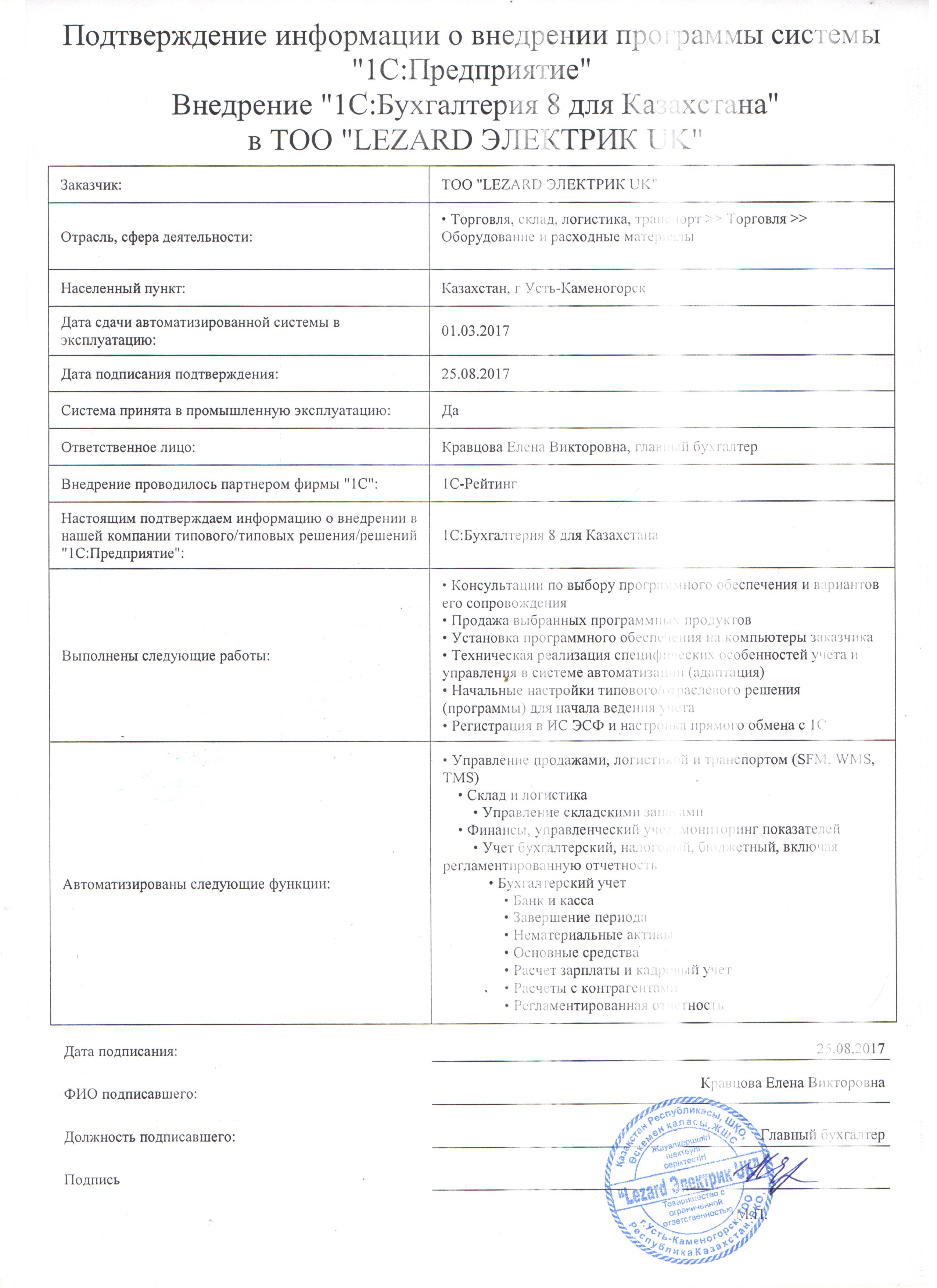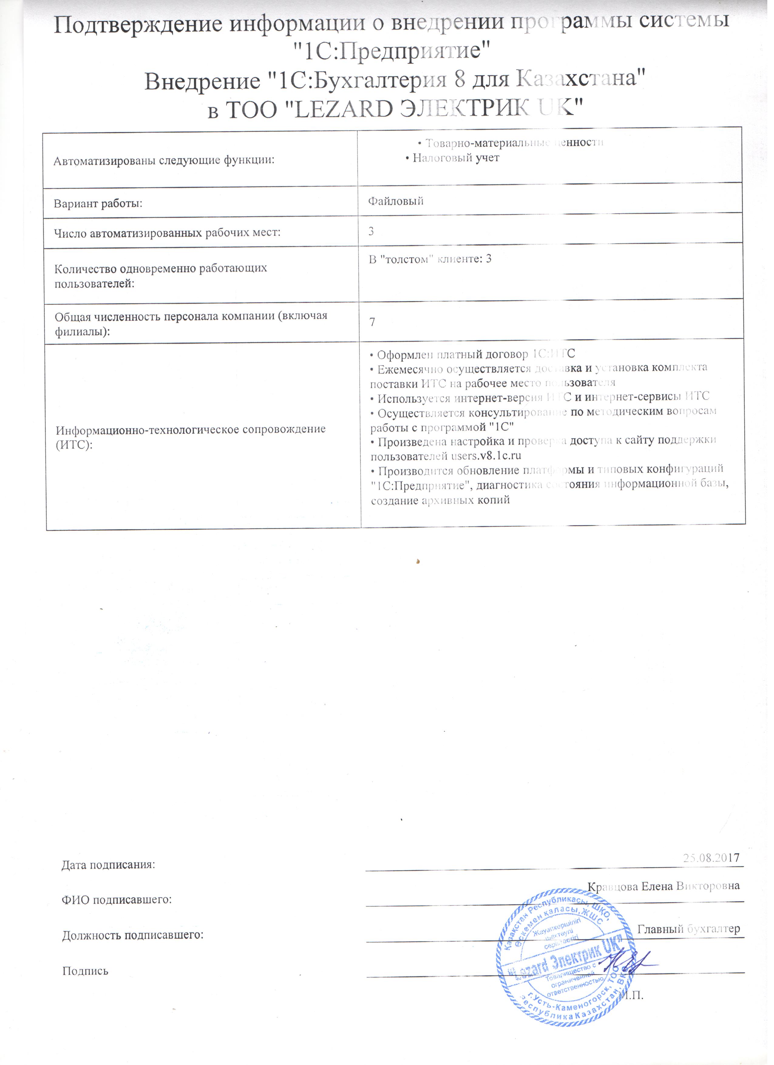 | Внедренное типовое решение: | 1С:Бухгалтерия 8 для Казахстана |