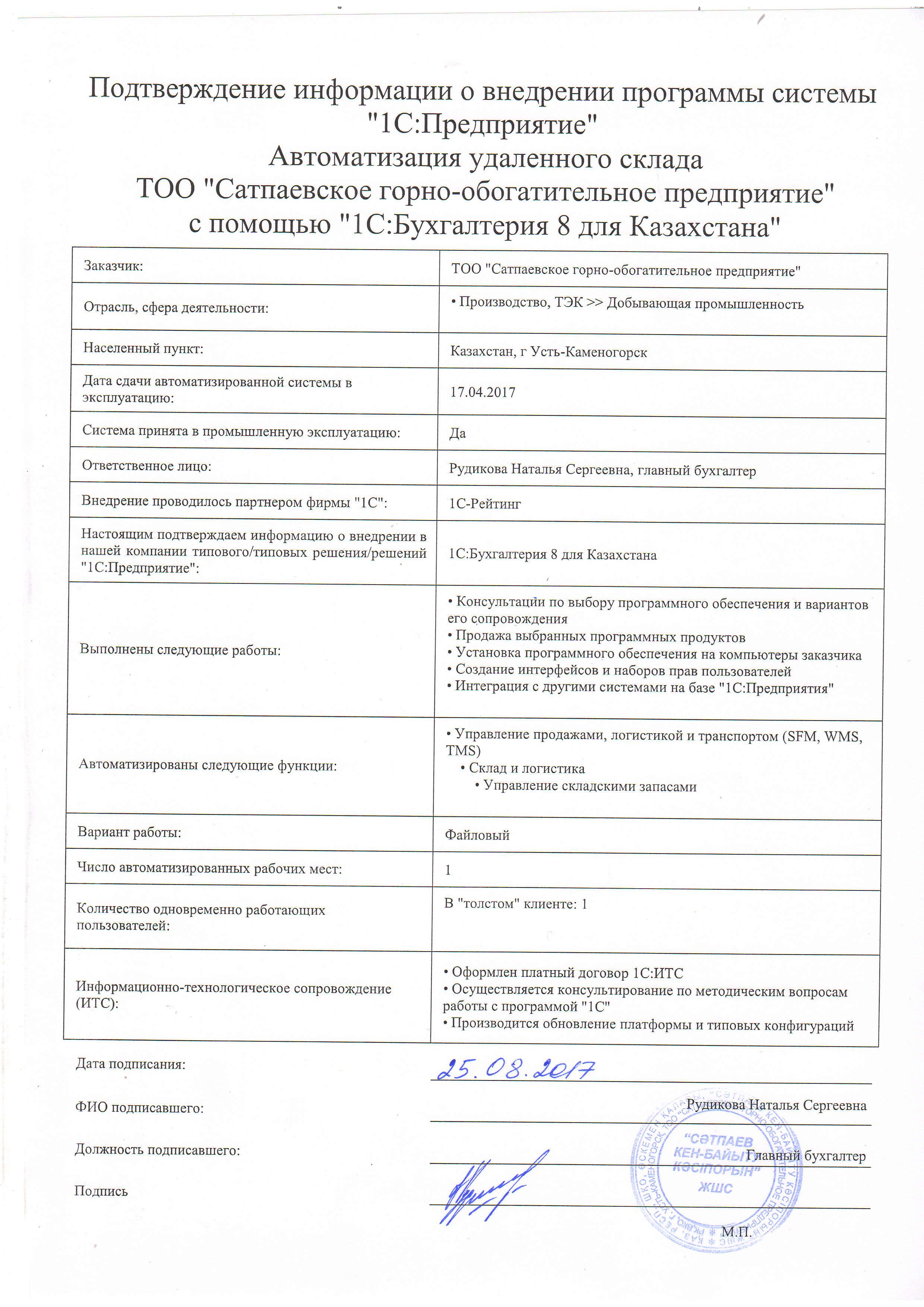 | Внедренное типовое решение: | 1С:Бухгалтерия 8 для Казахстана |