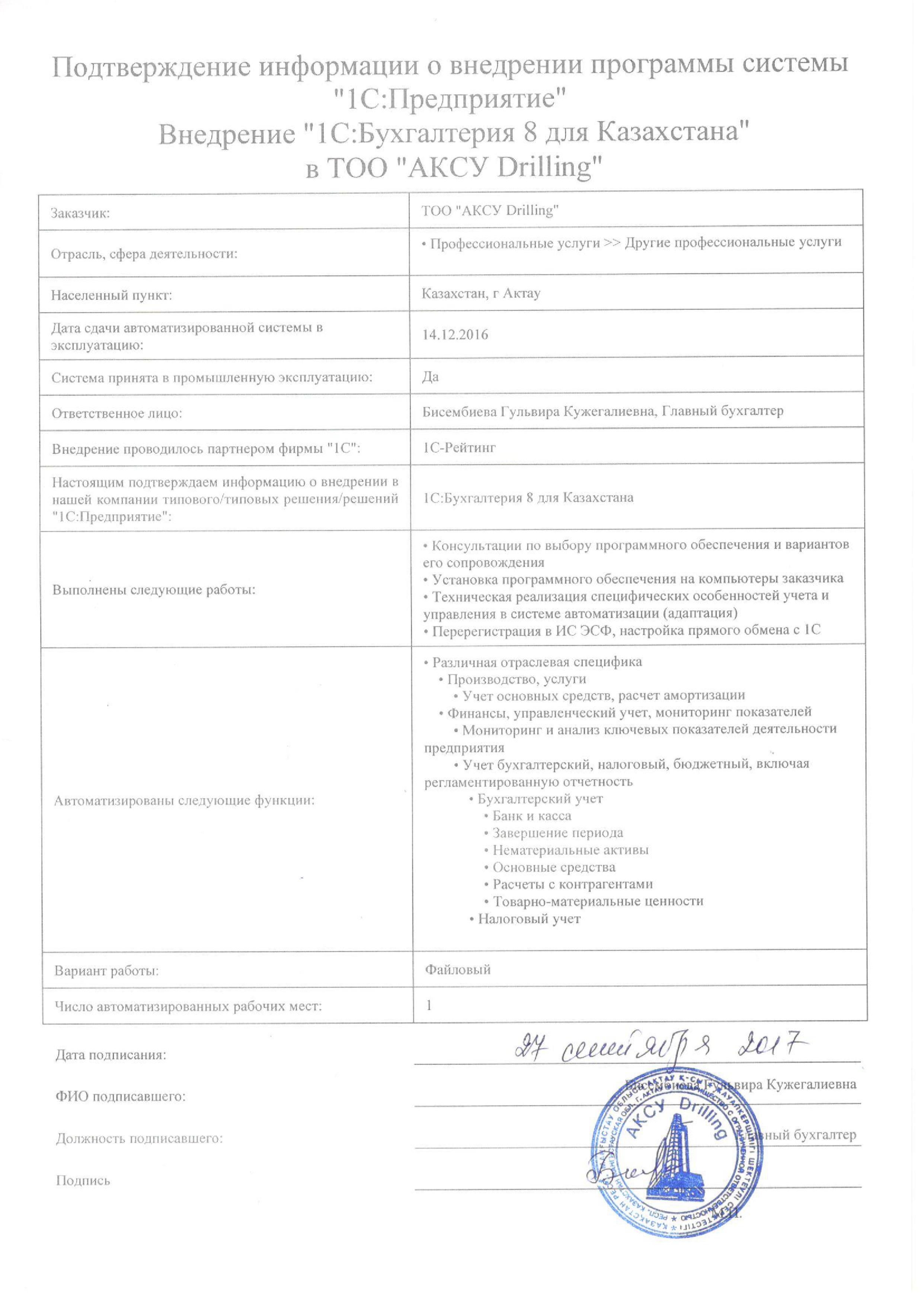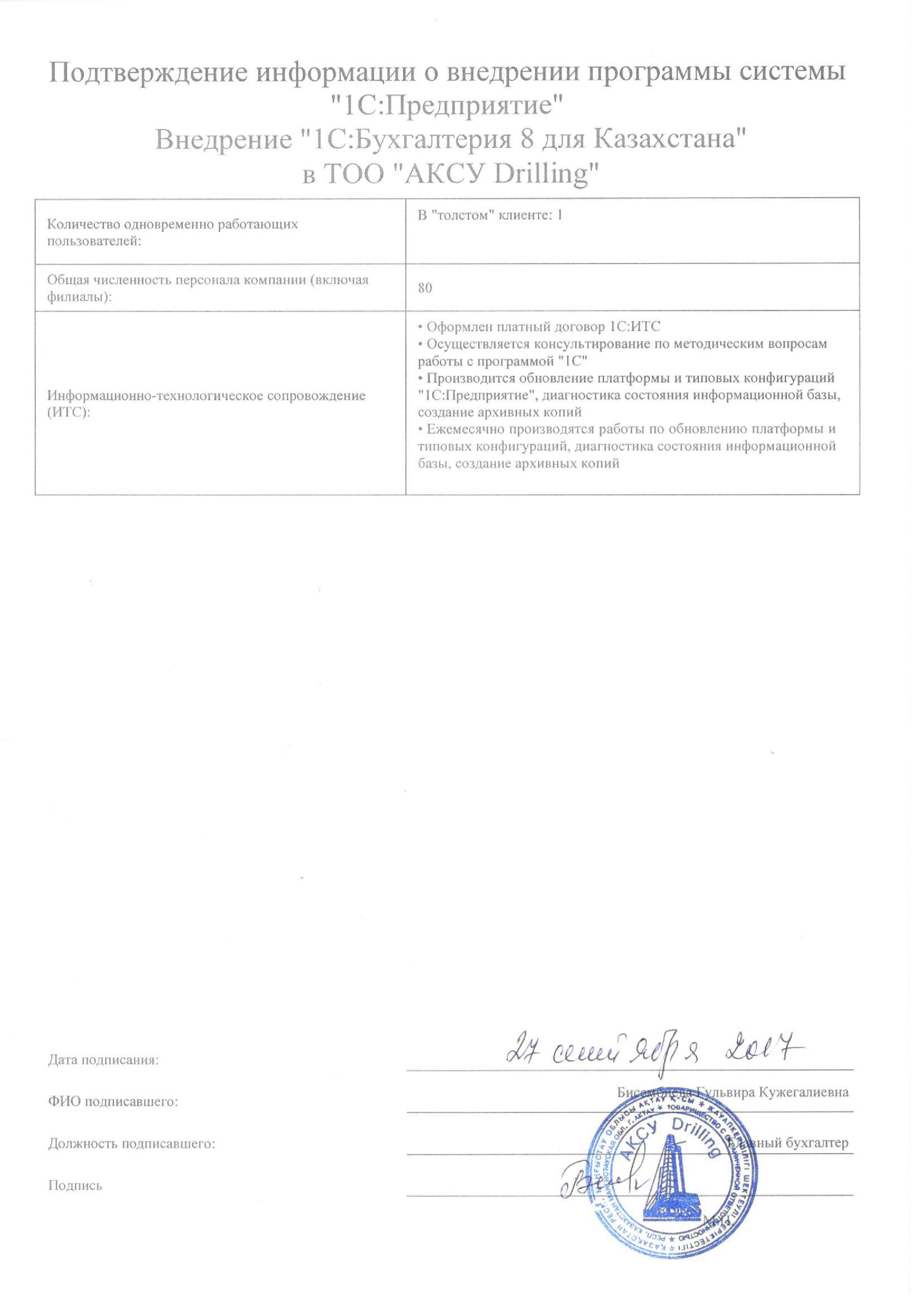 | Внедренное типовое решение: | 1С:Бухгалтерия для Казахстана