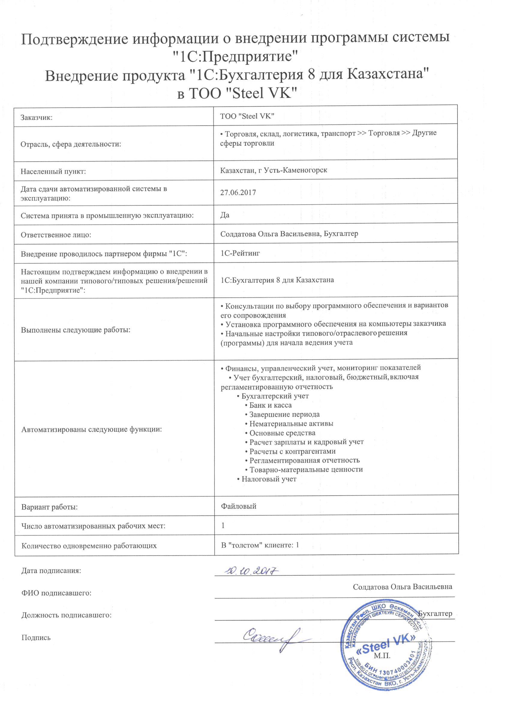 | Внедренное типовое решение: | 1С:Бухгалтерия 8 для Казахстана |