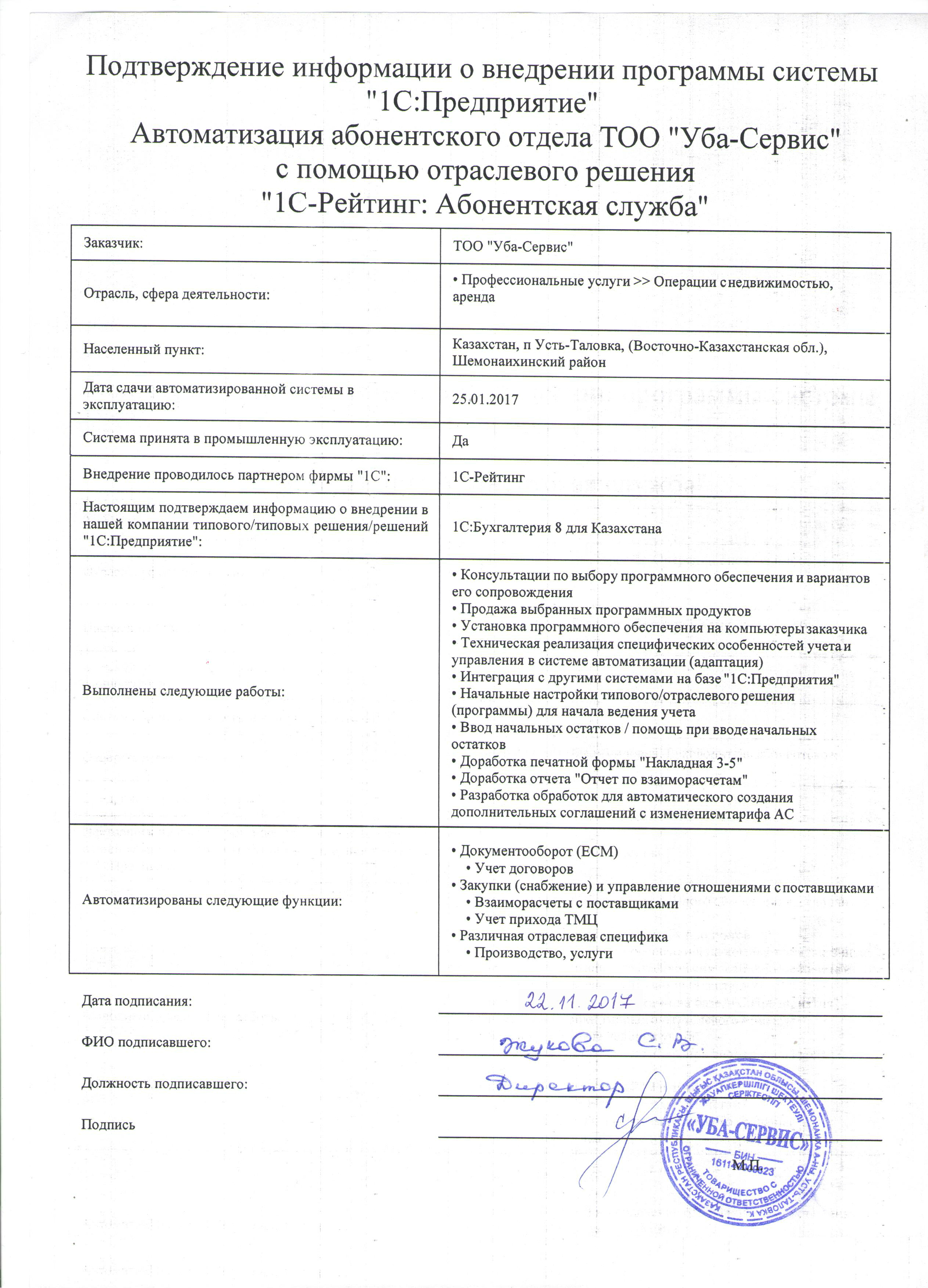 | Внедренные решения: | 1С-Рейтинг: Абонентская служба |