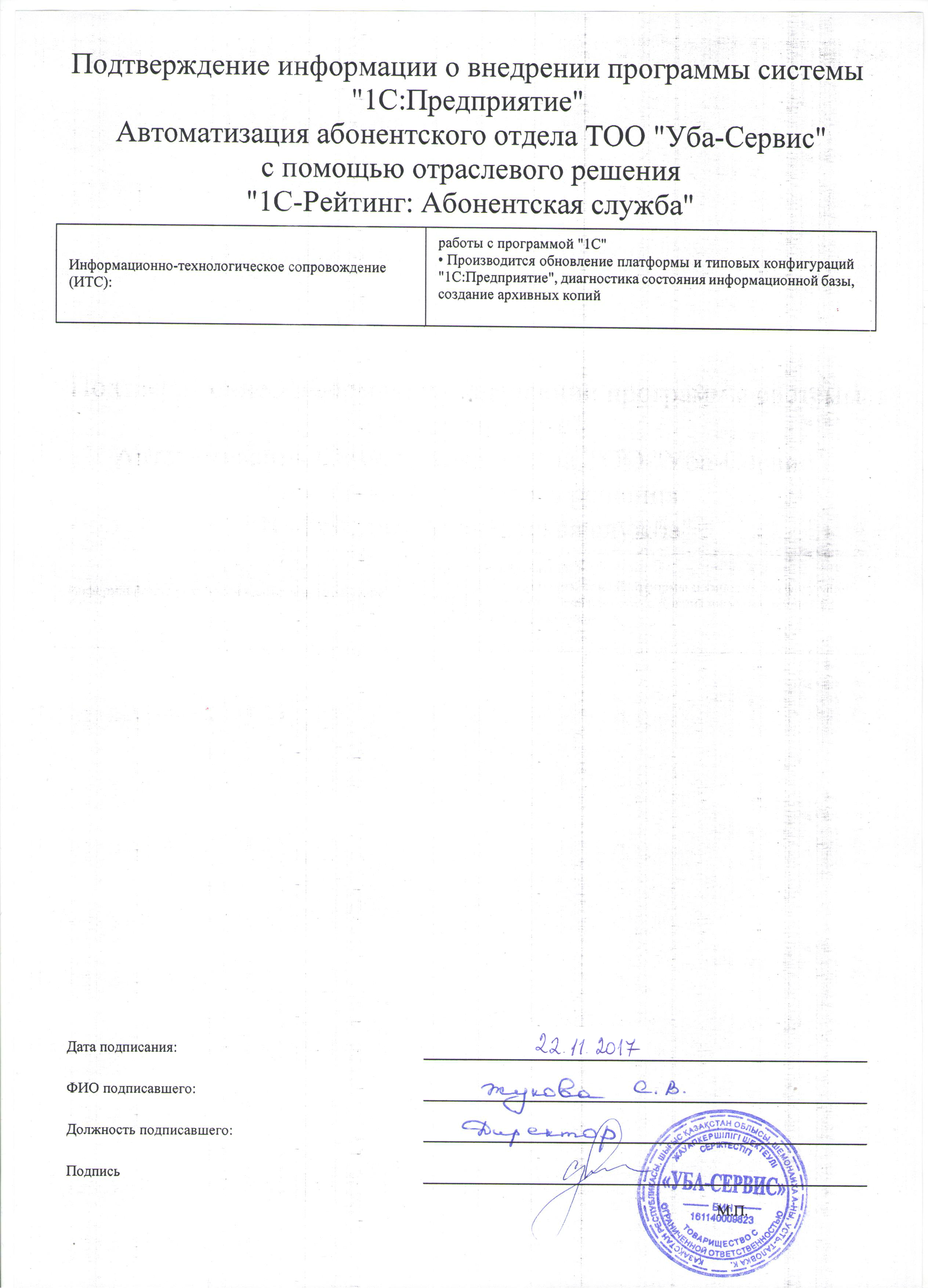 - Производится обновление платформы и типовых конфигураций 1С:Предприятие, диагностика состояния информационной базы, создание архивных копий