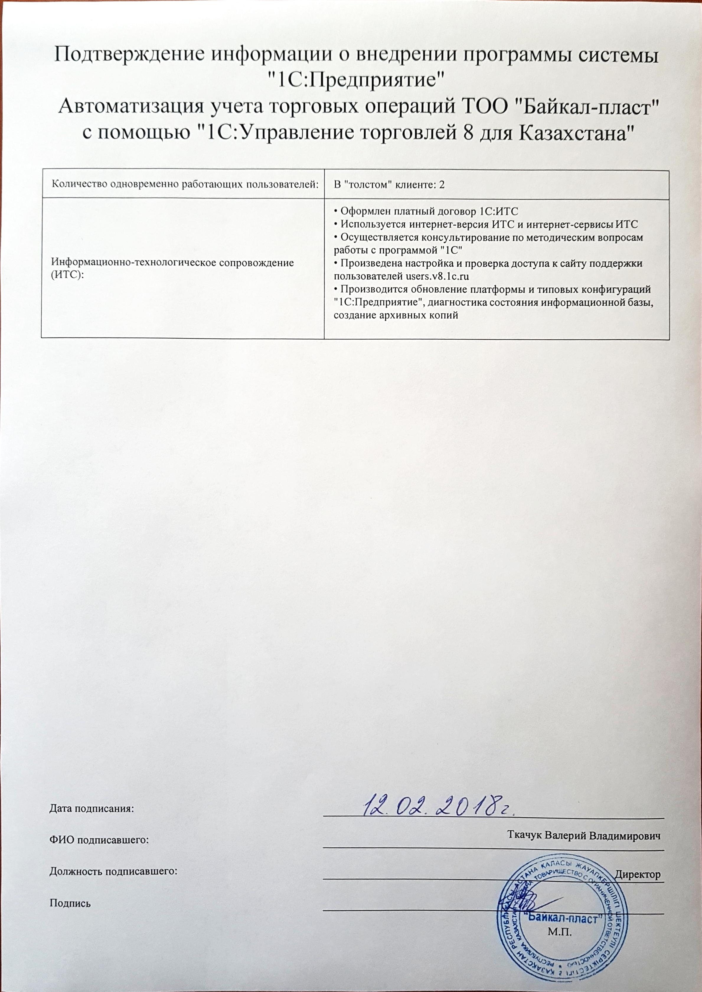 | Внедренное типовое решение: | 1С:Управление торговлей 8 для Казахстана |