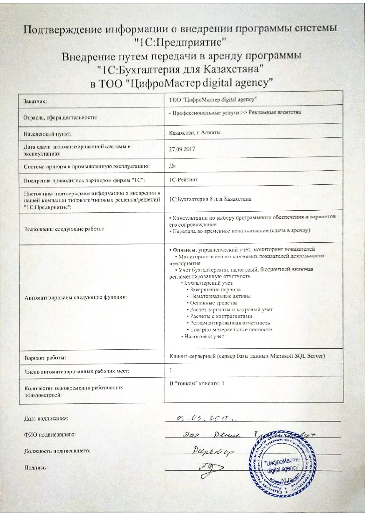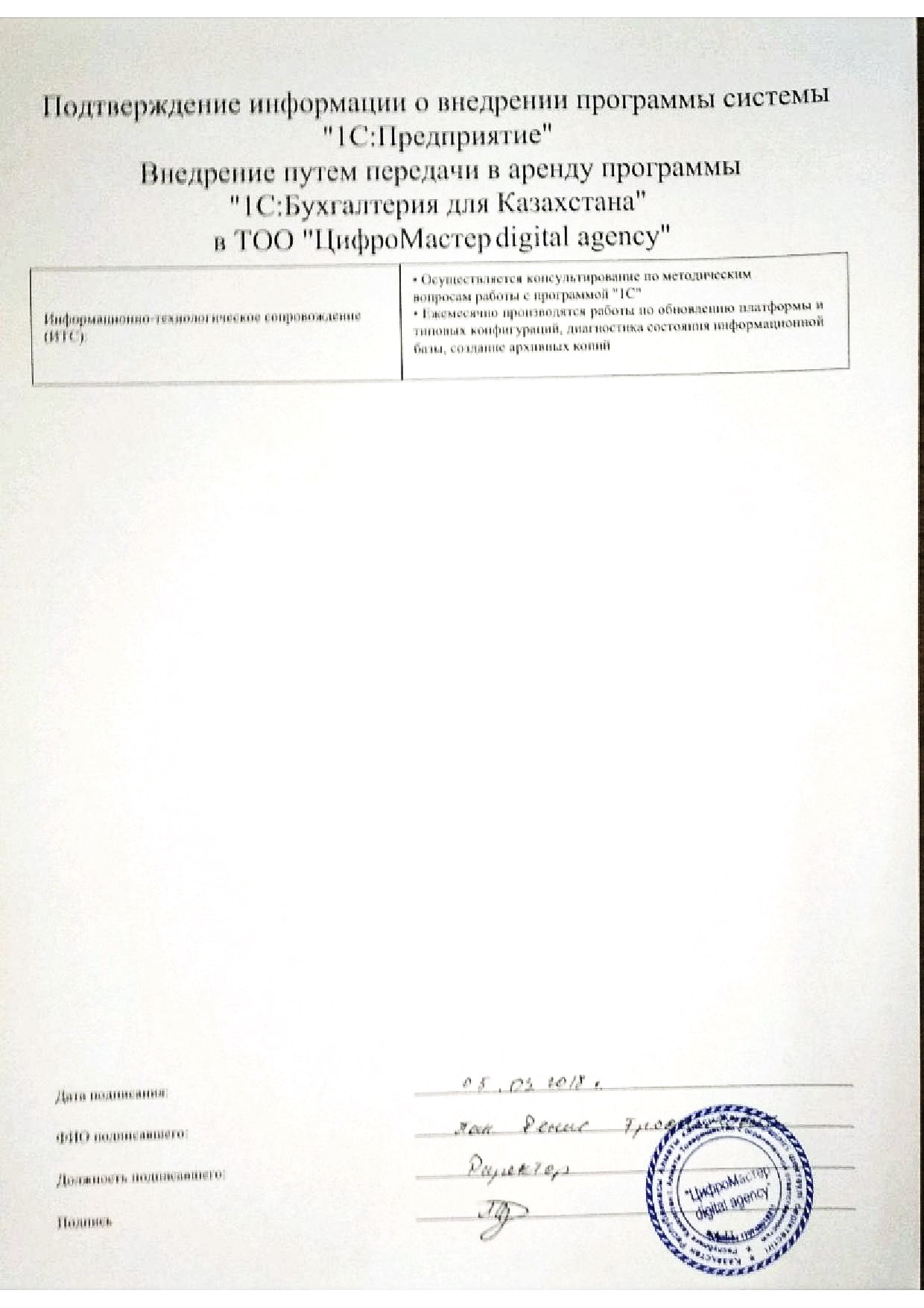 | Арендованное типовое решение: | 1С:Бухгалтерия для Казахстана |