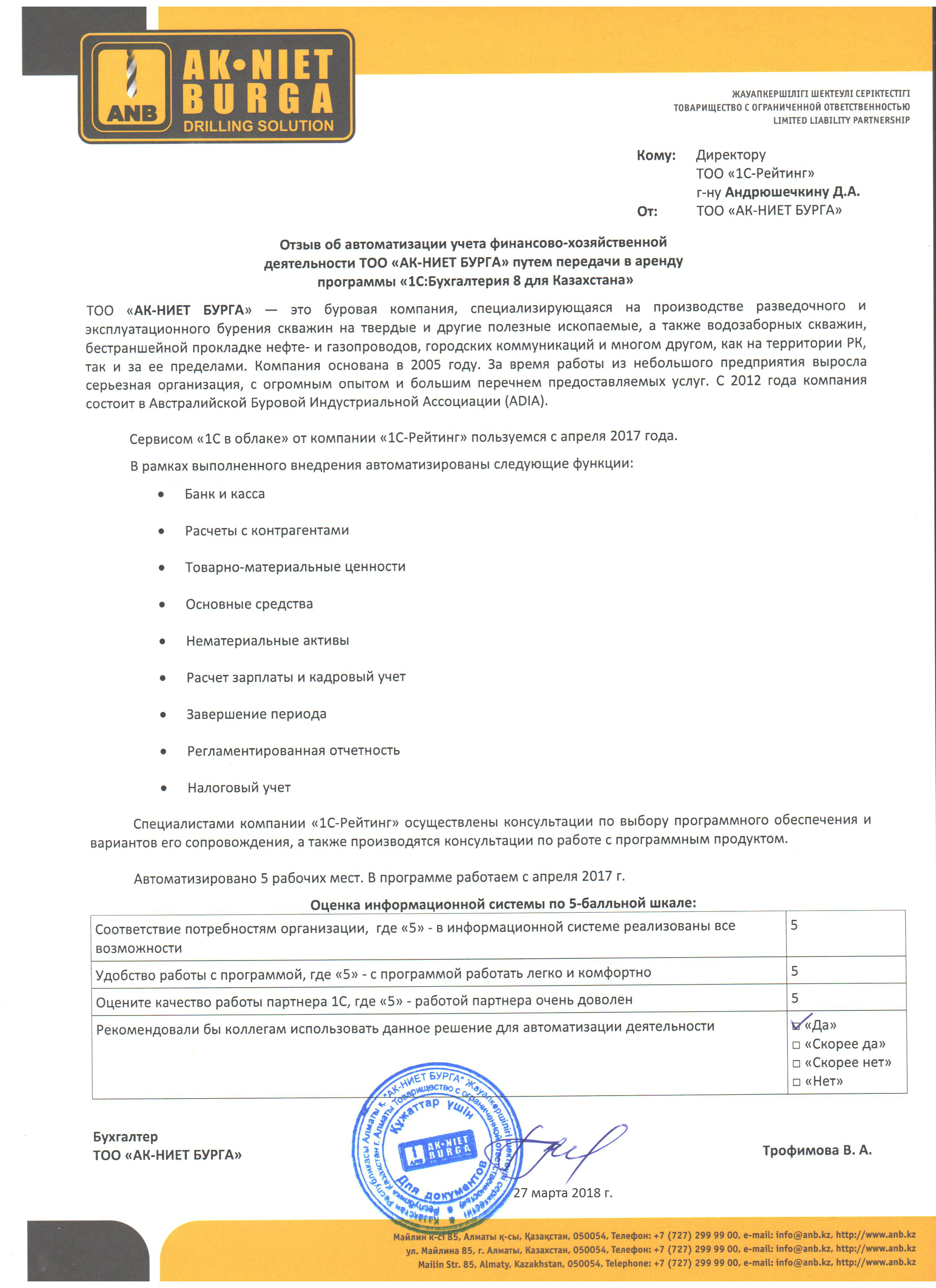 | Арендованное типовое решение: | 1С:Бухгалтерия для Казахстана |