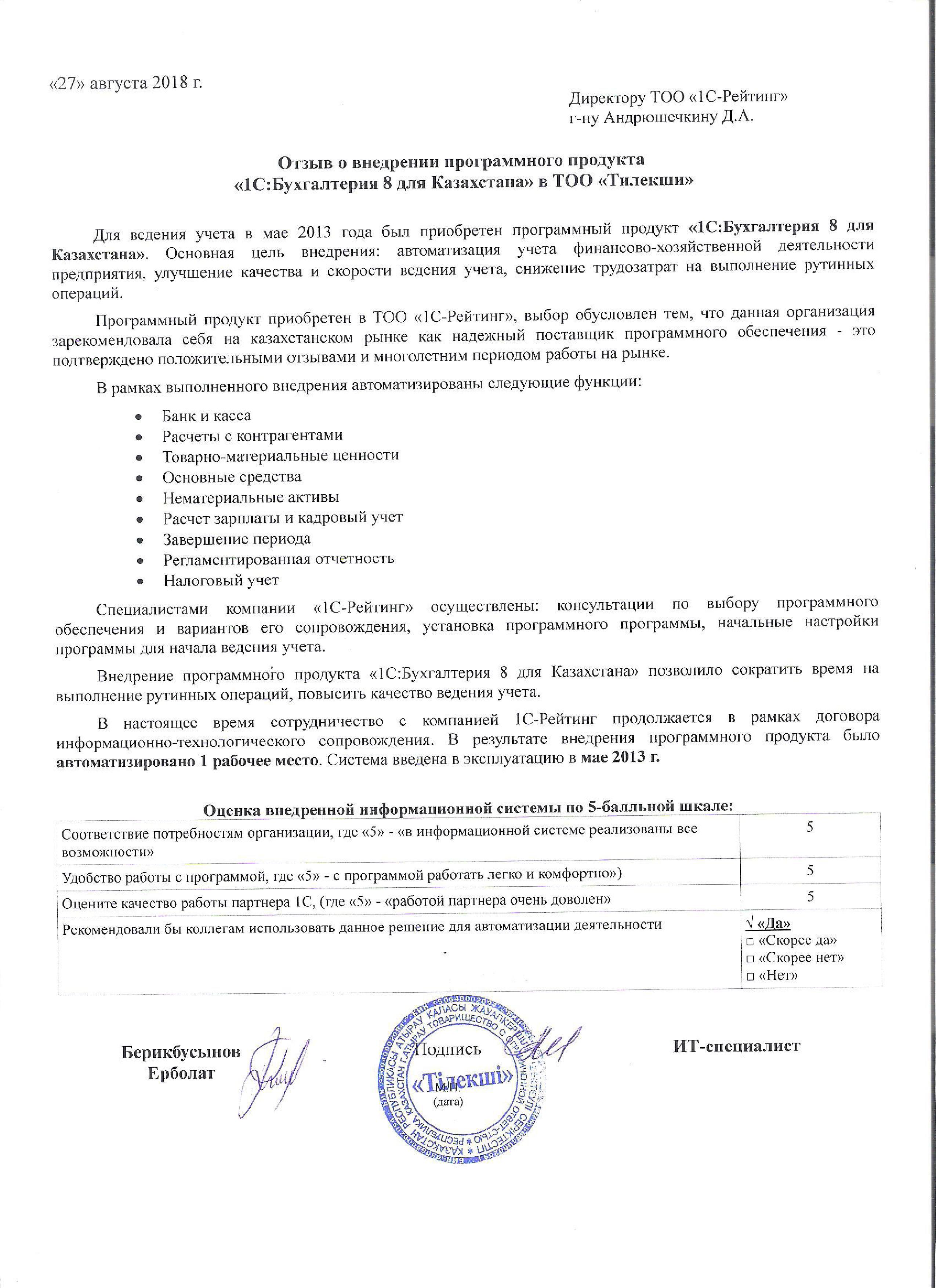 | Внедренное типовое решение: | 1С:Бухгалтерия 8 для Казахстана |