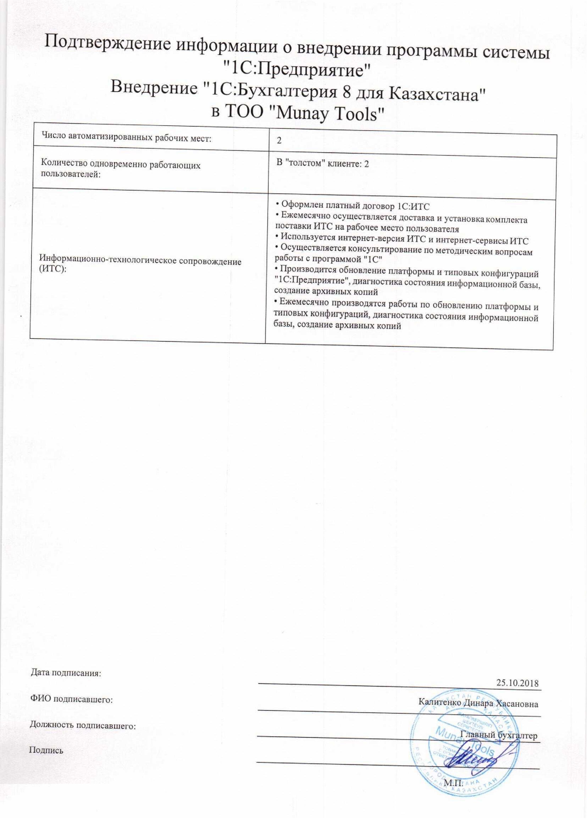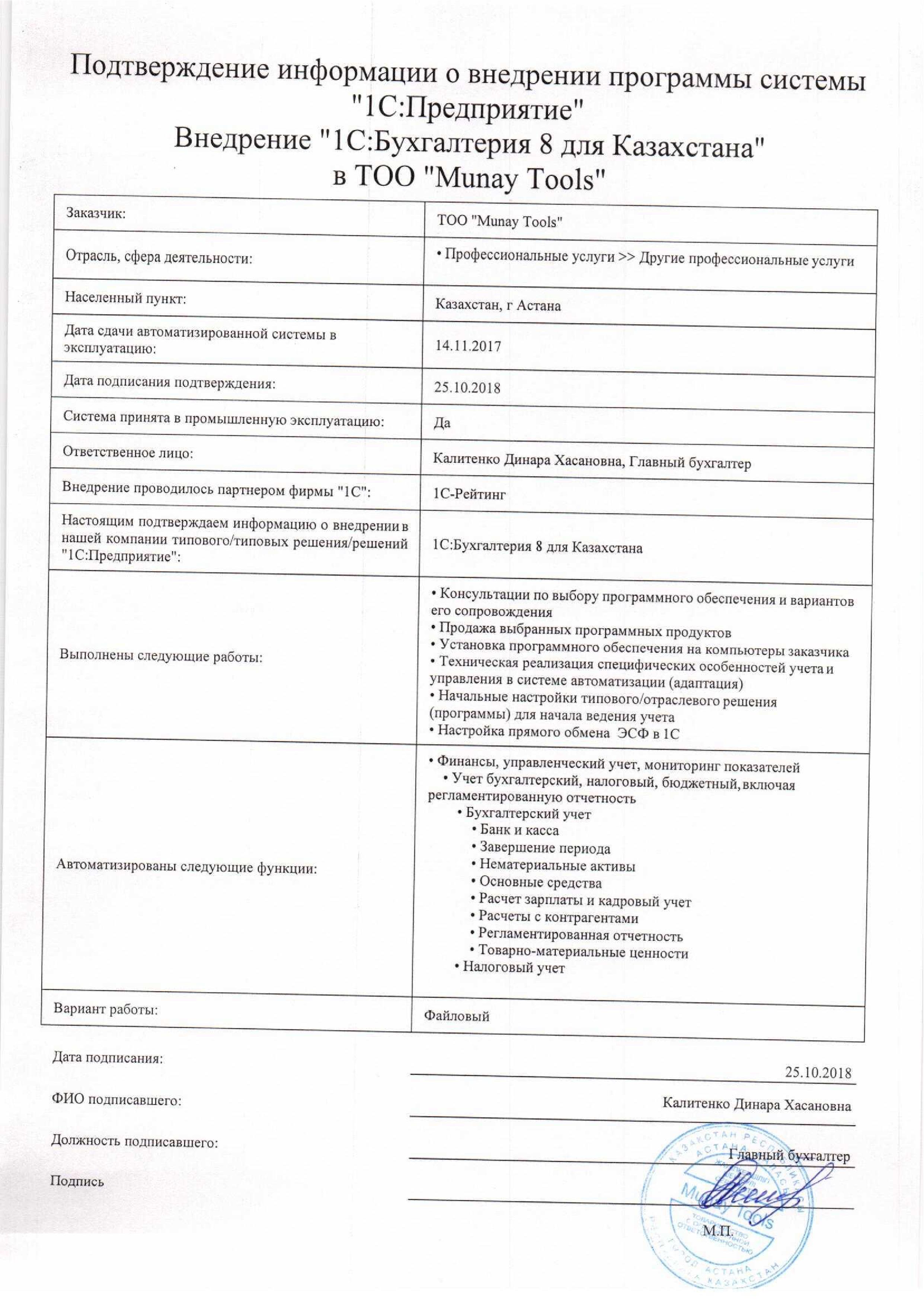 | Внедренное типовое решение: | 1С:Бухгалтерия 8 для Казахстана |