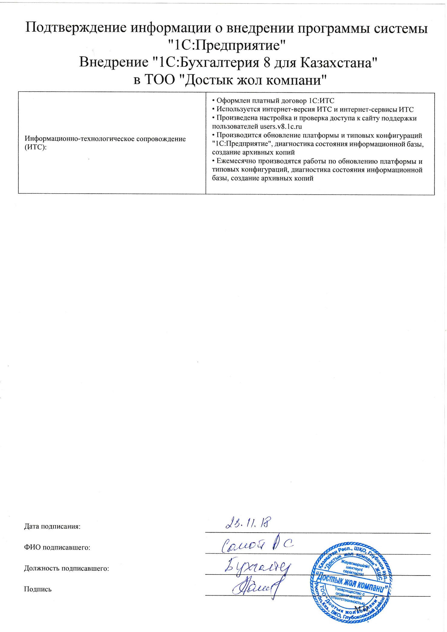 | Внедренное типовое решение: | 1С:Бухгалтерия 8 для Казахстана |