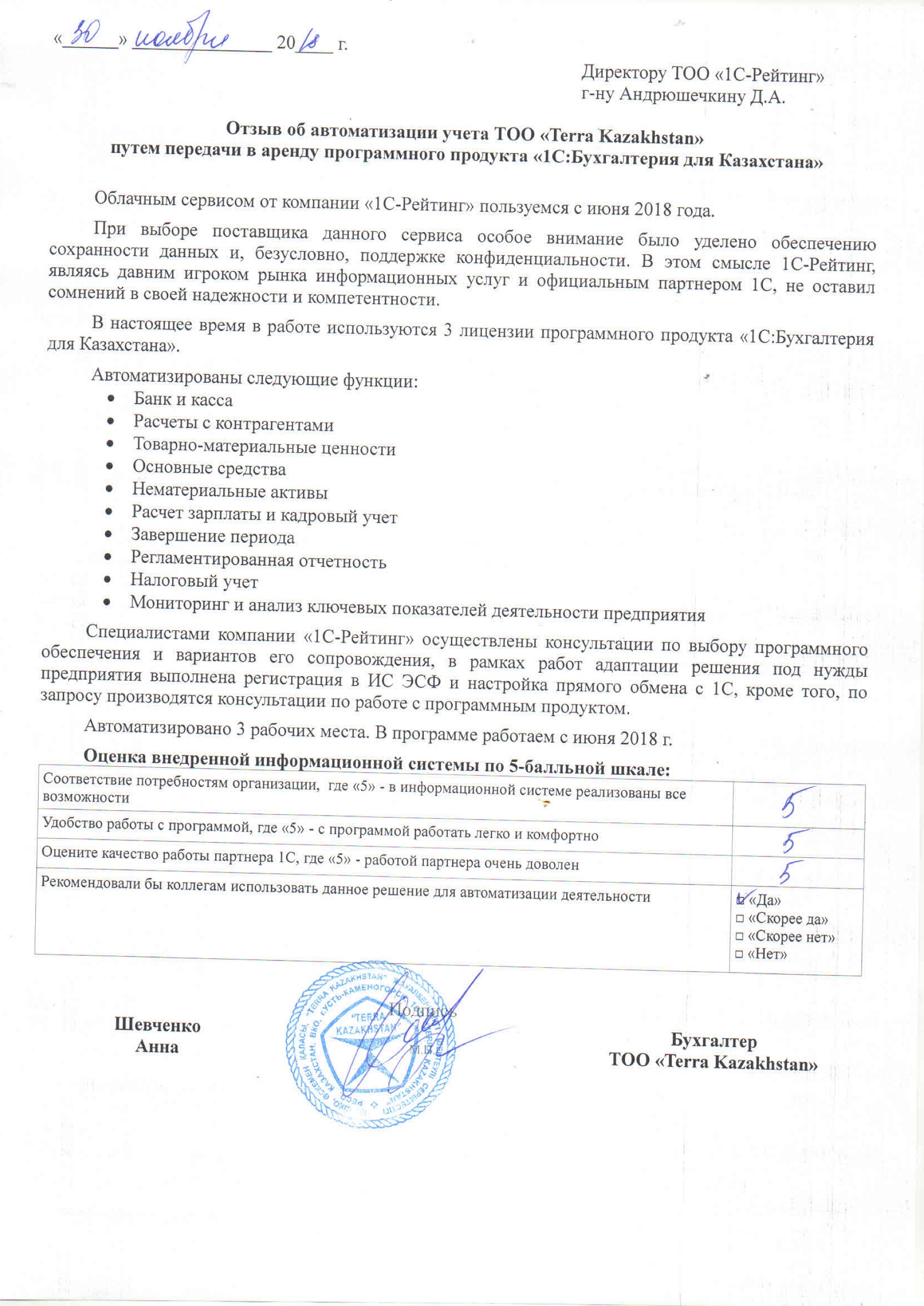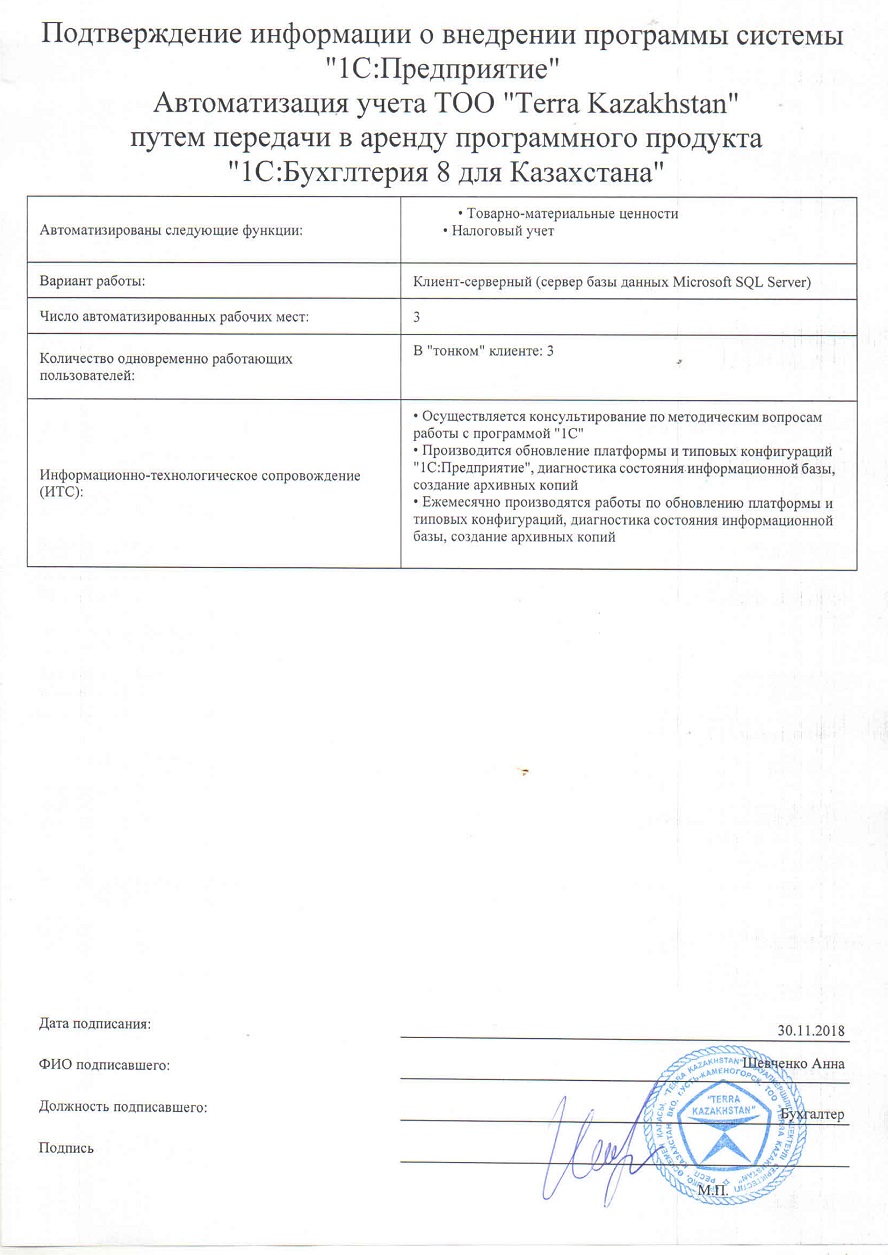 Автоматизация учета ТОО «Terra Kazakhstan» путем передачи в аренду программного продукта «1С:Бухгалтерия для Казахстана»