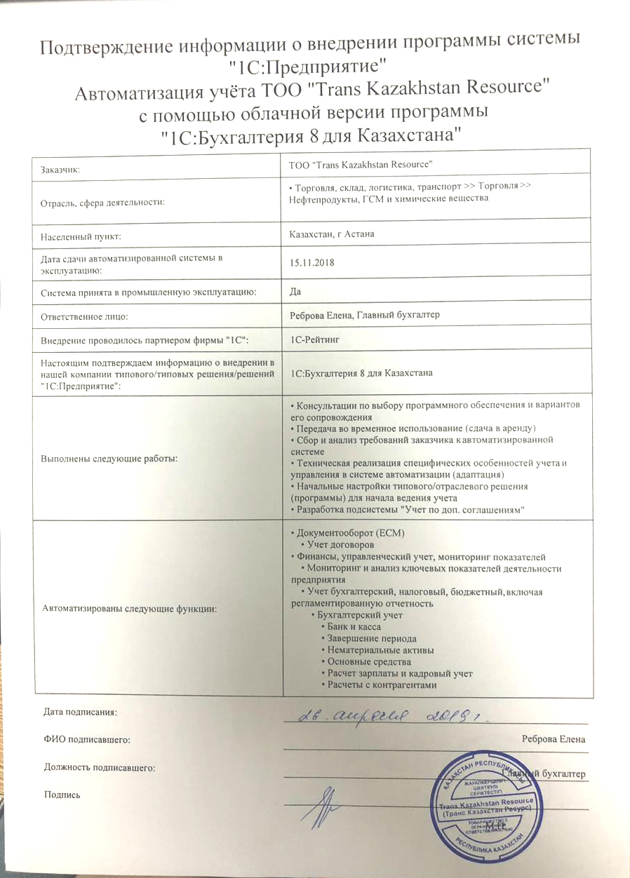 Автоматизация учёта ТОО «Trans Kazakhstan Resource» с помощью облачной версии программы «1С:Бухгалтерия для Казахстана»