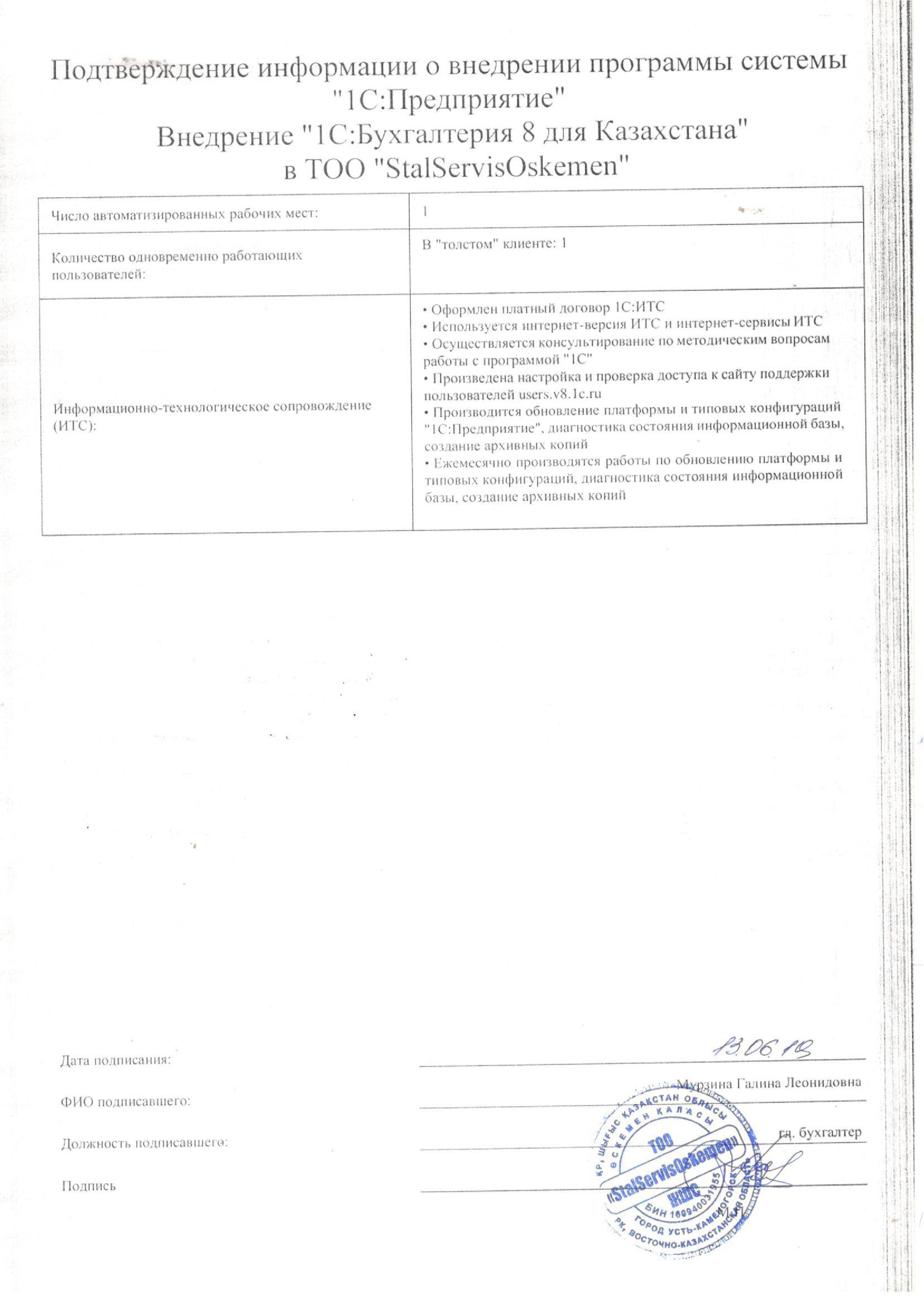 | Внедренное типовое решение: | 1С:Бухгалтерия 8 для Казахстана |