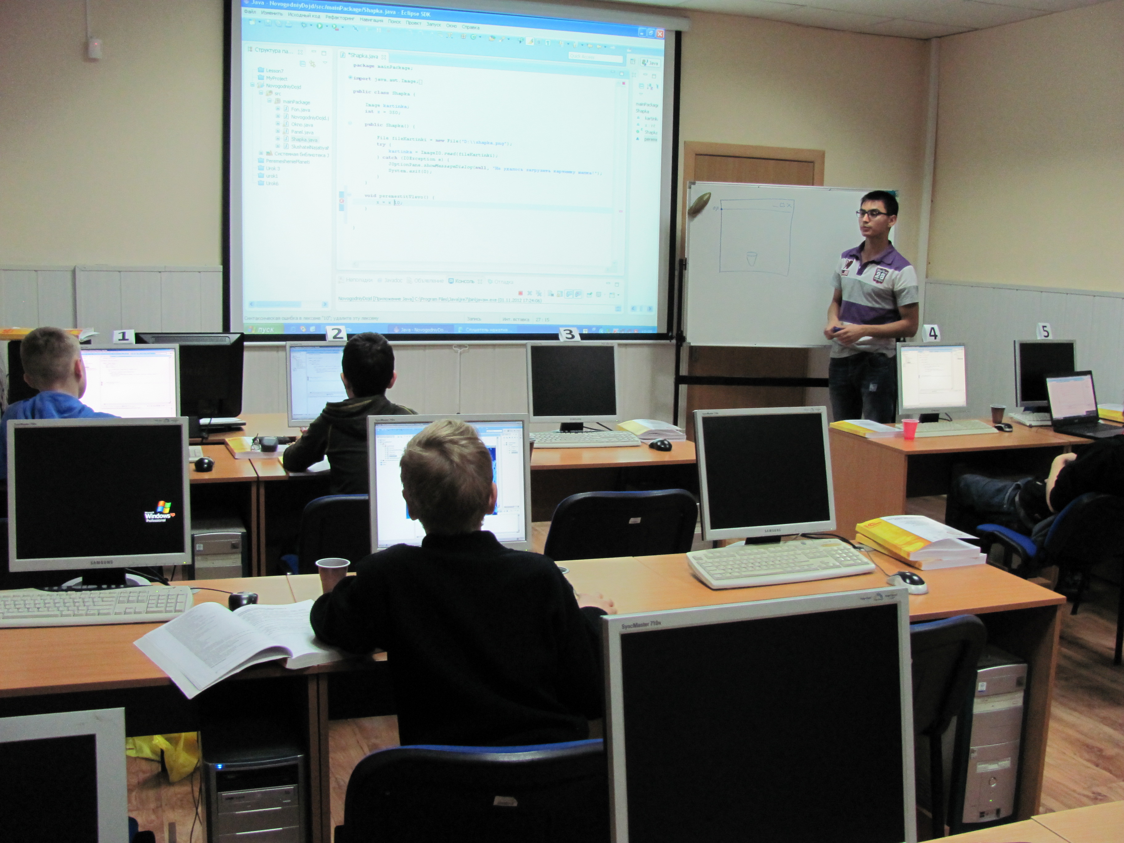 В октябре прошла обучение первая группа по курсу «JAVA», в состав которой вошли учащиеся школы и профессионального колледжа. На вопрос: «Что Вам больше всего понравилось?» Учащиеся ответили: «Возможность самостоятельно создать первую в жизни игру, выступая в роли уже не как пользователя, а как программиста». Также слушатели отметили высокую подготовленность преподавателя, его интересную и понятную форму передачи, казалось бы, такой сложной темы.