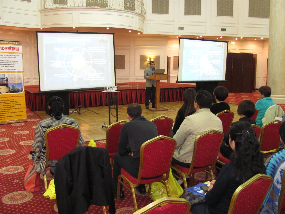 В городах Алматы и Атырау в сентябре 2013 года специалисты компании 1С-Рейтинг провели практическую конференцию «Инструменты управленческого учета и бюджетирования» для предприятий, заинтересованных в оперативном управлении финансовыми потоками и финансовом планировании. Формат мероприятия предполагал обзорную часть и наглядную демонстрацию функциональных возможностей программных продуктов линейки «1С-Рейтинг: Финансы и Бюджетирование». В практическую часть семинара вошли мастер-классы в режиме «1С:Предпяриятие 8» по настройке бюджетов и проведению план-фактного анализа, регистрации договоров с поставщиком и настройке графика платежей, автоматизации казначейских функций.