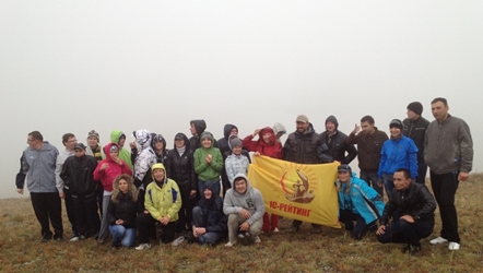 Как взошло светило на небо осеннее, оглядел люд окрестности сибинские, да был поражен красотой гор здешних и озером, что в горном кольце расположено. За трапезой утренней решение было принято о покорении горы высокой всей компанией дружной. И направились к вершине все, несмотря на препятствия разные и погоду ненастную, да покорили вершину ту грозную. И ясно стало всем, что для дружной сплоченной команды нет препятствий на пути любом. И на радости этой решили они состязания спортивные устроить да эмоции положительные получить. Не было предела фантазии спортивной – и катания на конях железных, что велосипедами в народе зовутся, и перекидывания мяча с названием иноземным «волейбол», и ладьи на воду спустили да в регату водную отправились, места невиданные оглядывать. И развивалось на ветру знамя желтое, и не было там ни проигравших, ни победивших, а только радость и дух единства.