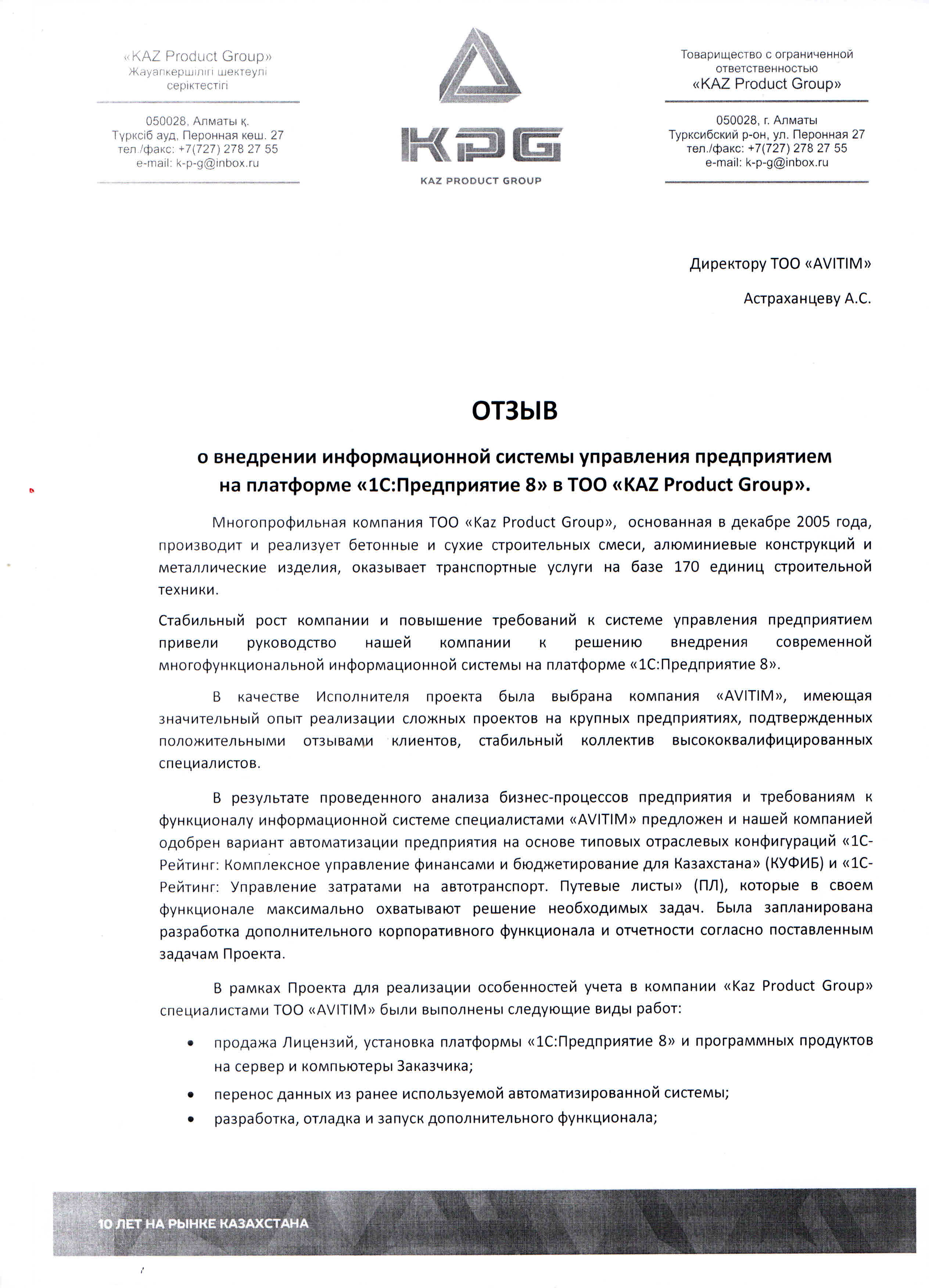 Компания ТОО «AVITIM» зарекомендовало себя как надежный партнер, работы выполнены в заранее согласованные сроки. Ответственный подход к задачам заказчика, качество услуг и высокий профессиональный уровень команды специалистов позволяют нам с уверенностью рекомендовать компанию «AVITIM» как добросовестного исполнителя для реализации крупных уникальных проектов на платформе «1C:Предприятие 8».