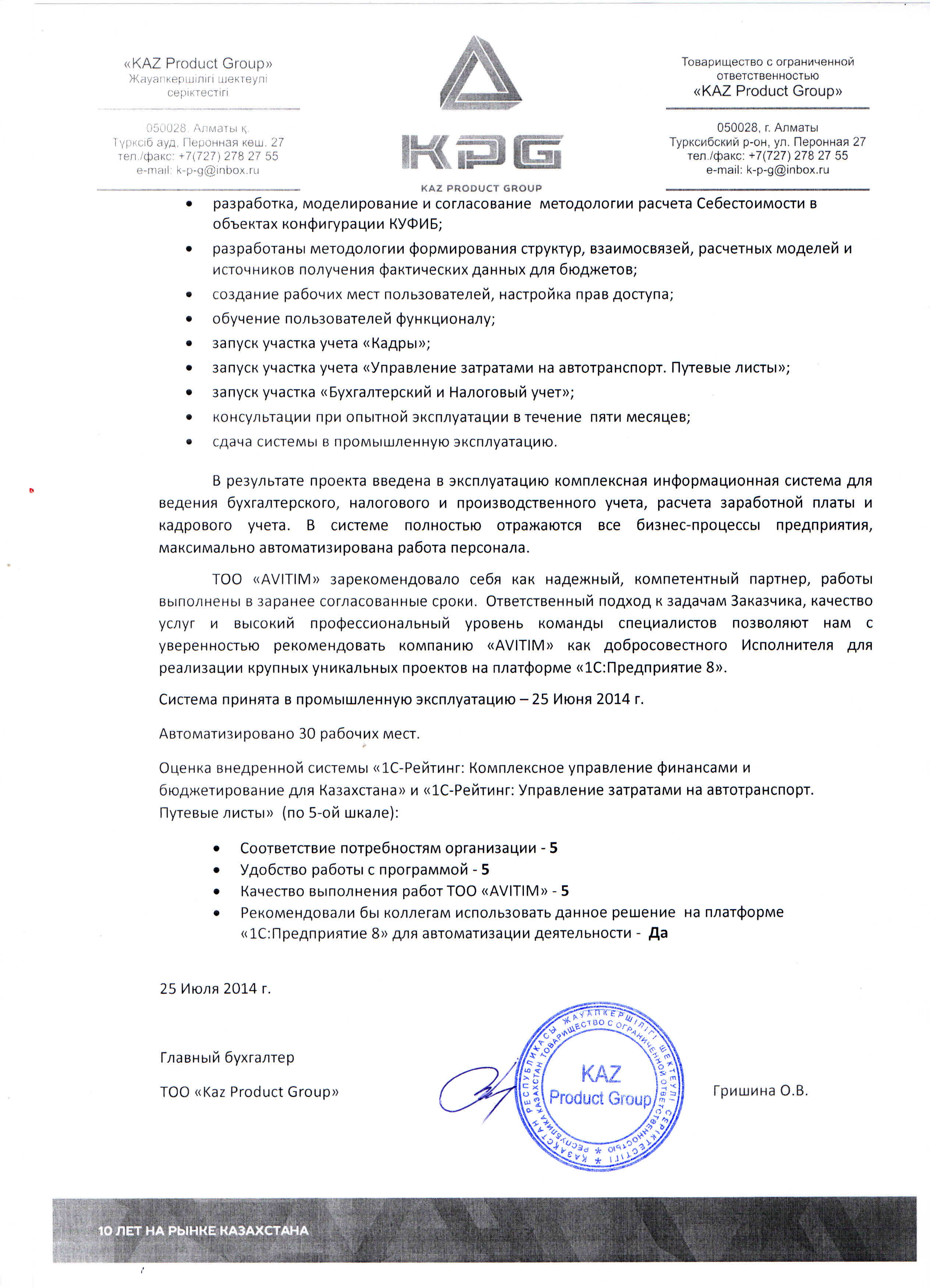 Компания «AVITIM» успешно завершила проект внедрения информационной системы в ТОО «Kaz Product Group» на базе отраслевых решении «1С-Рейтинг: Комплексное управление финансами и бюджетирование для Казахстана» и «1С-Рейтинг: Управление затратами на автотранспорт. Путевые листы».