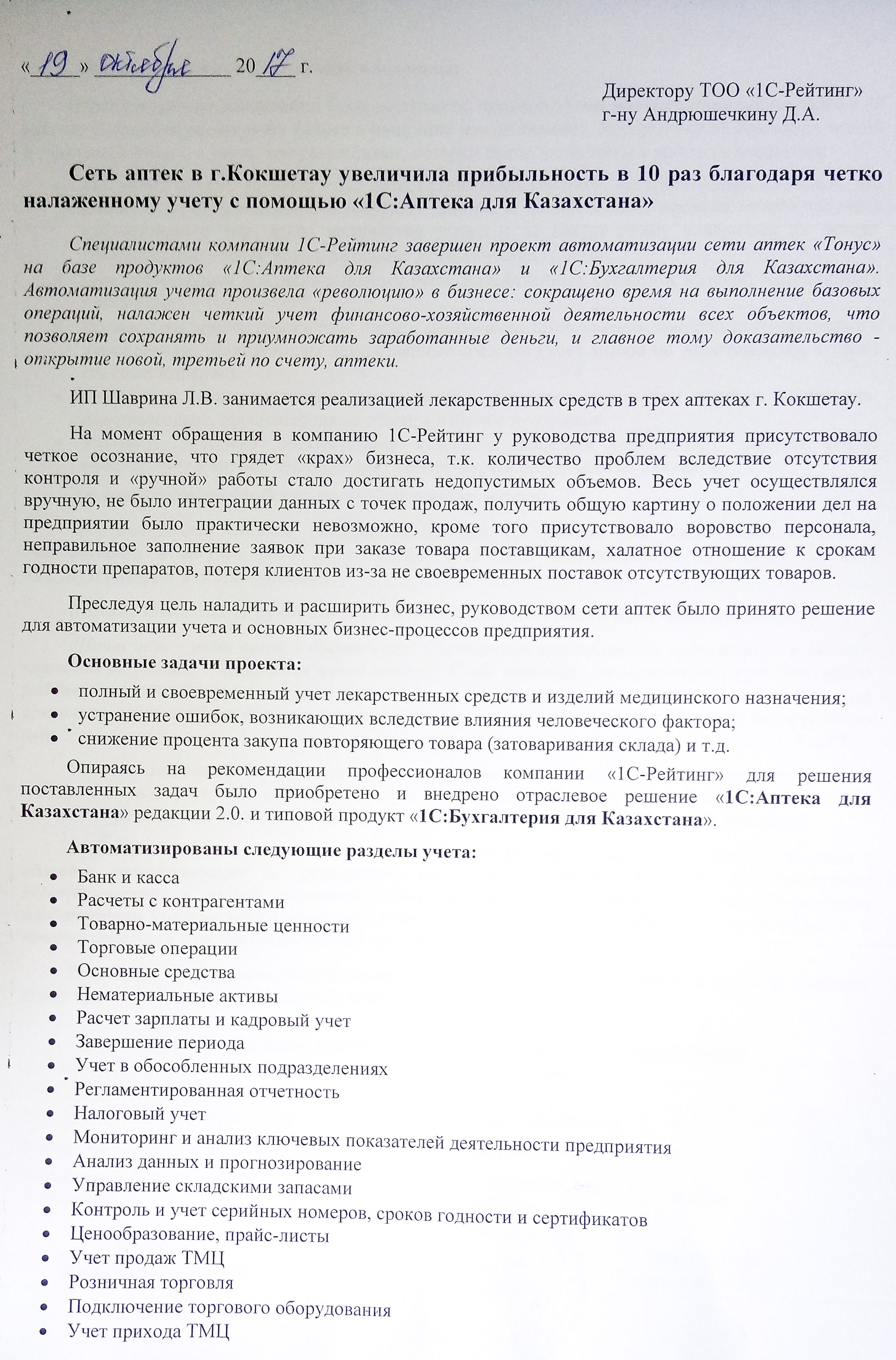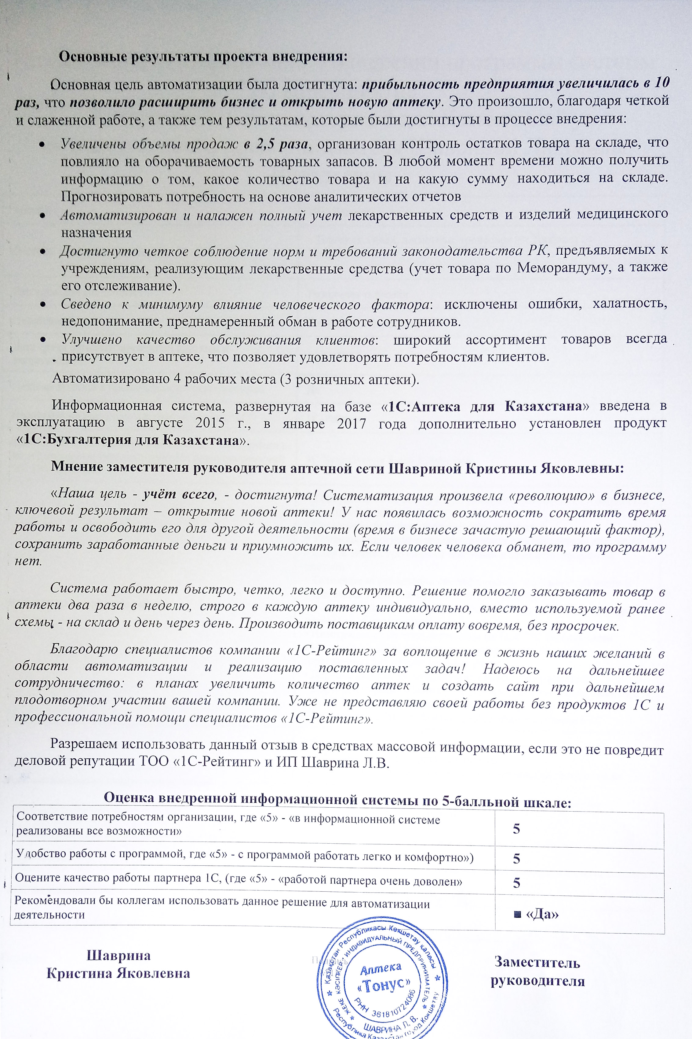 Специалистами компании 1С-Рейтинг завершён проект автоматизации сети аптек «Тонус» на базе продуктов «1С:Аптека для Казахстана» и «1С:Бухгалтерия для Казахстана». Автоматизация учёта произвела «революцию» в бизнесе: сокращено время на выполнение базовых операций, налажен чёткий учёт финансово-хозяйственной деятельности всех объектов, что позволяет сохранять и приумножать заработанные деньги, и главное тому доказательство — открытие новой, третьей по счёту, аптеки.