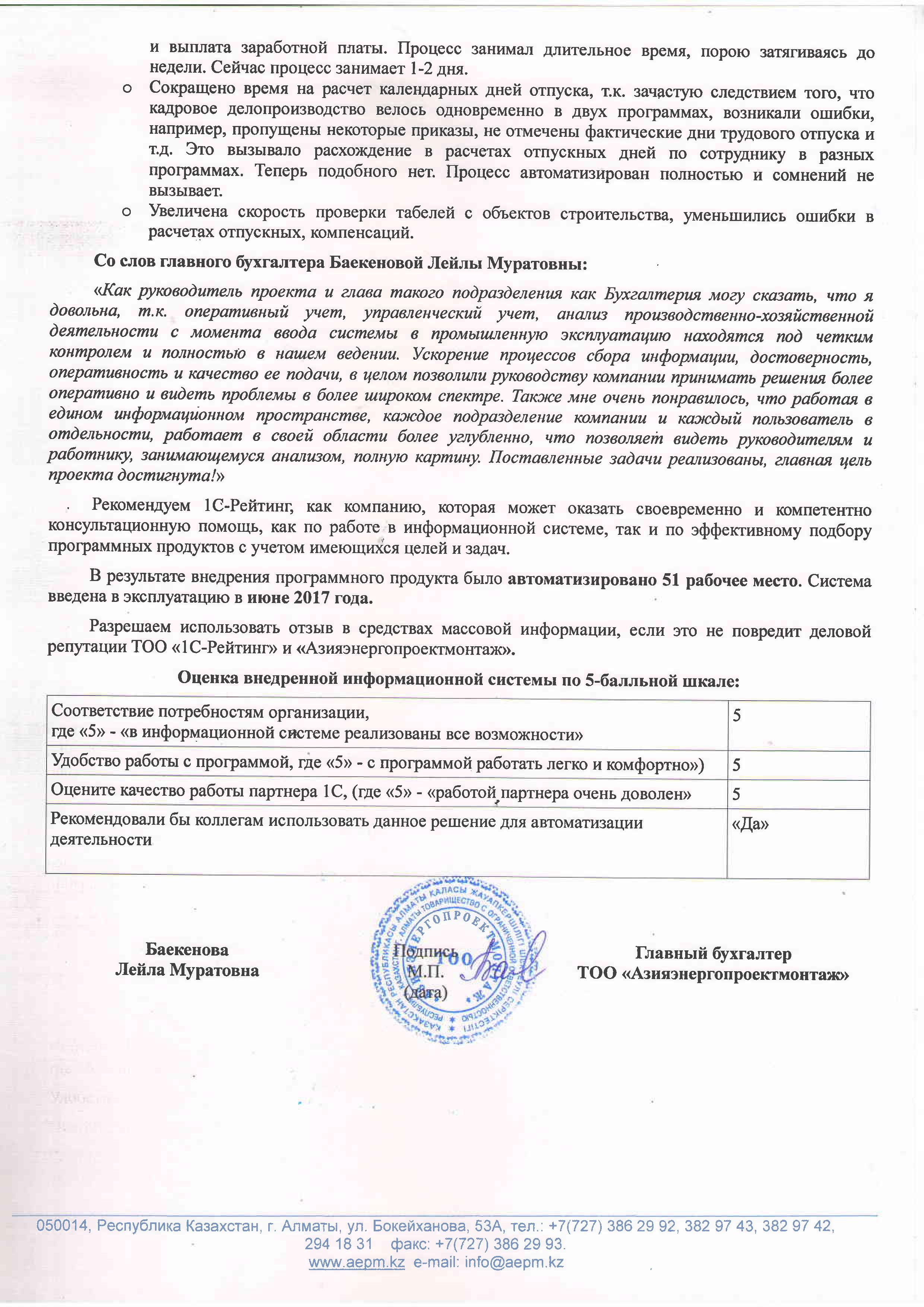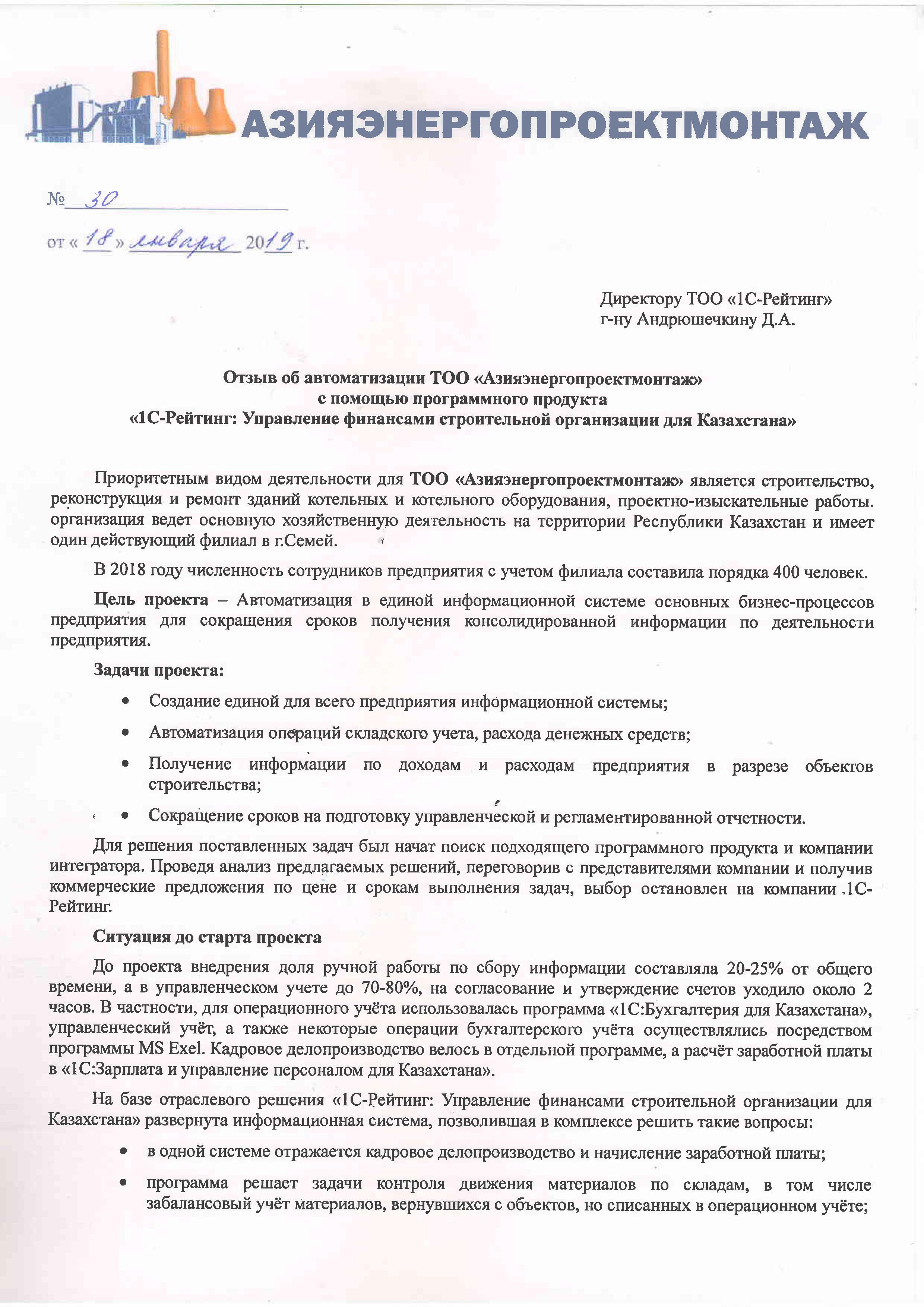 На базе отраслевого решения «1С-Рейтинг: Управление финансами строительной организации для Казахстана» развернута информационная система, позволившая в комплексе решить вопросы учета на предприятии.