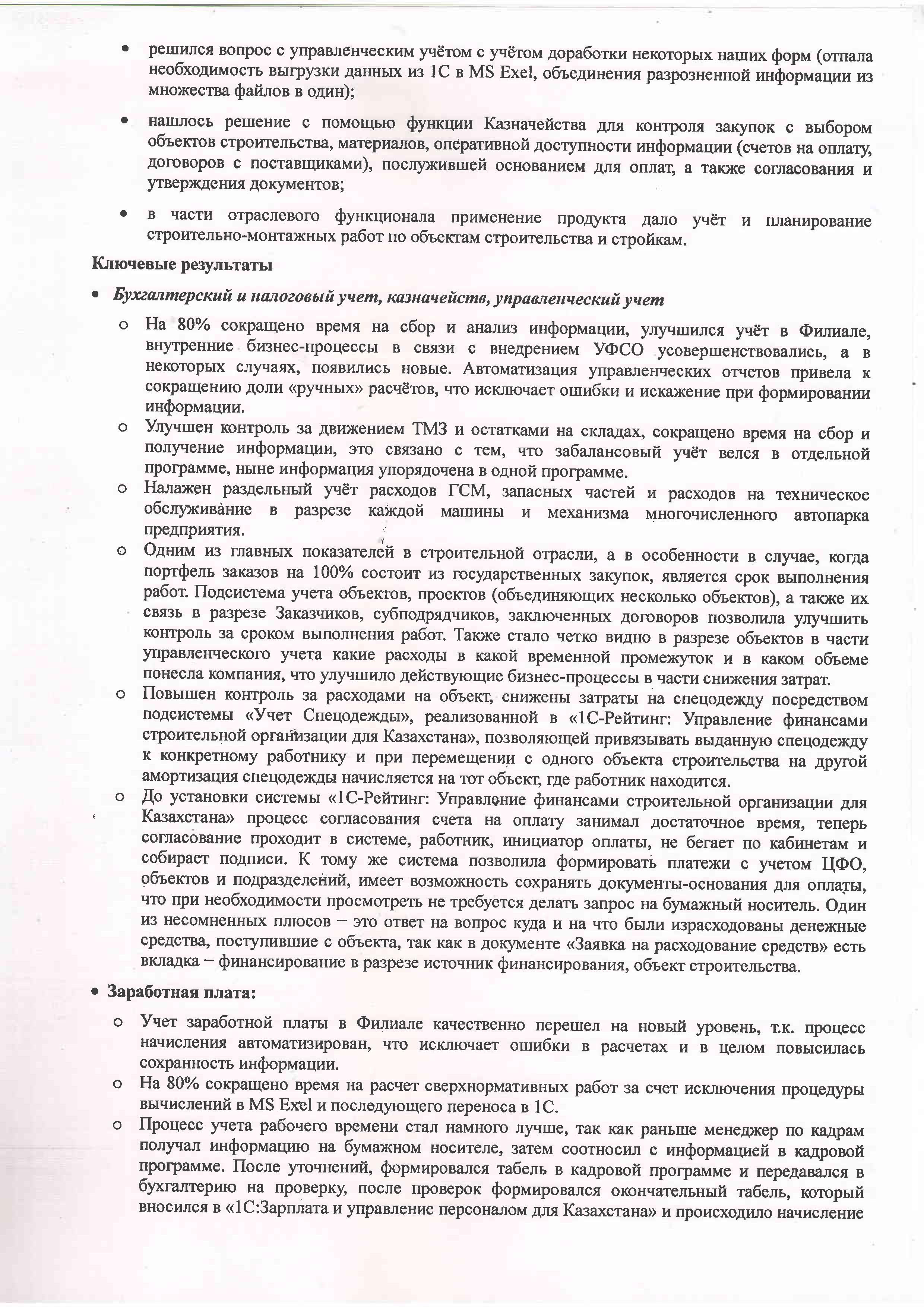 На базе отраслевого решения «1С-Рейтинг: Управление финансами строительной организации для Казахстана» (далее УФСО) развернута информационная система, позволившая в комплексе решить такие вопросы: