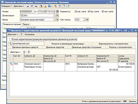 Для регистрации движения денежных средств по кассовым документам (приходному кассовому ордеру, расходному кассовому ордеру) в форме документа должна быть проставлена отметка "Оплачено". Дату оплаты специально указывать не требуется, поскольку для кассовых документов дата оплаты должна совпадать с датой документа. Проводки по кассовым документам также будут сформированы автоматически при условии простановки отметки "Отразить в бухгалтерском учете".