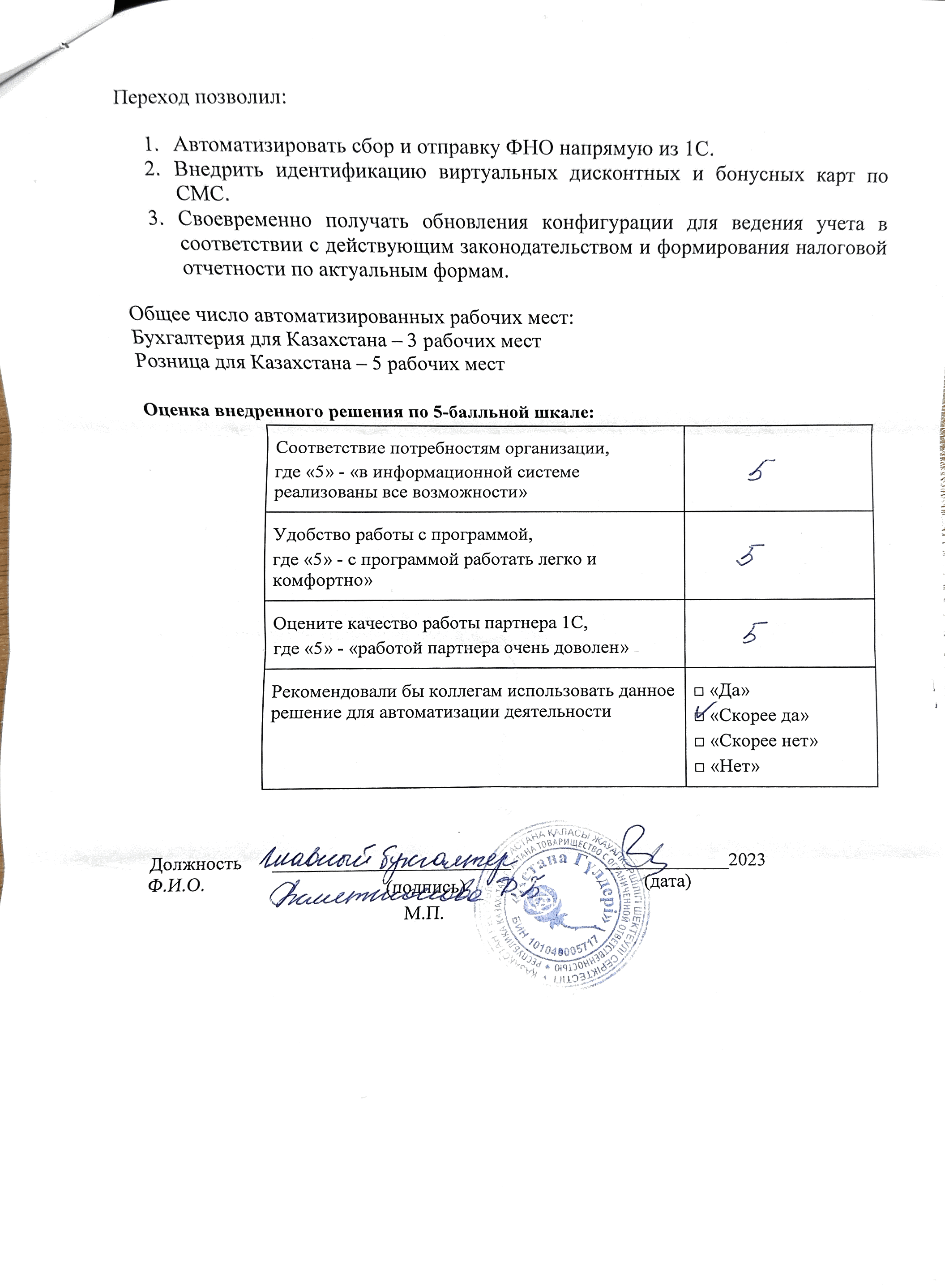 - Установлена учетная система на базе конфигурации «1С:Розница для Казахстана» редакции 2.3 для ведения учета розничных продаж в торговых точках