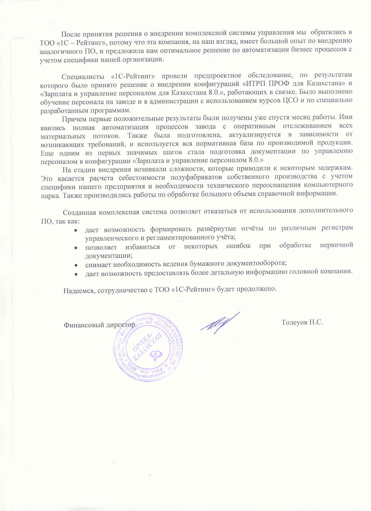 «Возможности данного продукта позволяют отказаться от использования дополнительного ПО, так как позволяют формировать более развёрнутые отчёты по различным регистрам управленческого и бухгалтерского учёта. Снимается необходимость ведения бумажного документооборота. Кроме того, мы получаем возможность, предоставлять более детальную информацию головной компании. Надеемся, сотрудничество с ТОО «1С-Рейтинг» будет продолжено».