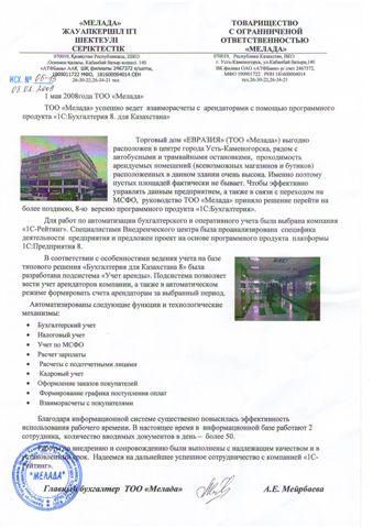 Торговый дом «ЕВРАЗИЯ» (ТОО «Мелада») выгодно расположен в центре города Усть-Каменогорска, рядом с автобусными и трамвайными остановками, проходимость арендуемых помещений (всевозможных магазинов и бутиков) расположенных в данном здании очень высока. Именно поэтому пустых площадей фактически не бывает. Чтобы эффективно управлять данным предприятием, а также в связи с переходом на МСФО, руководство ТОО «Мелада» приняло решение перейти на более позднюю, 8-ю версию программного продукта «1С:Бухгалтерия».