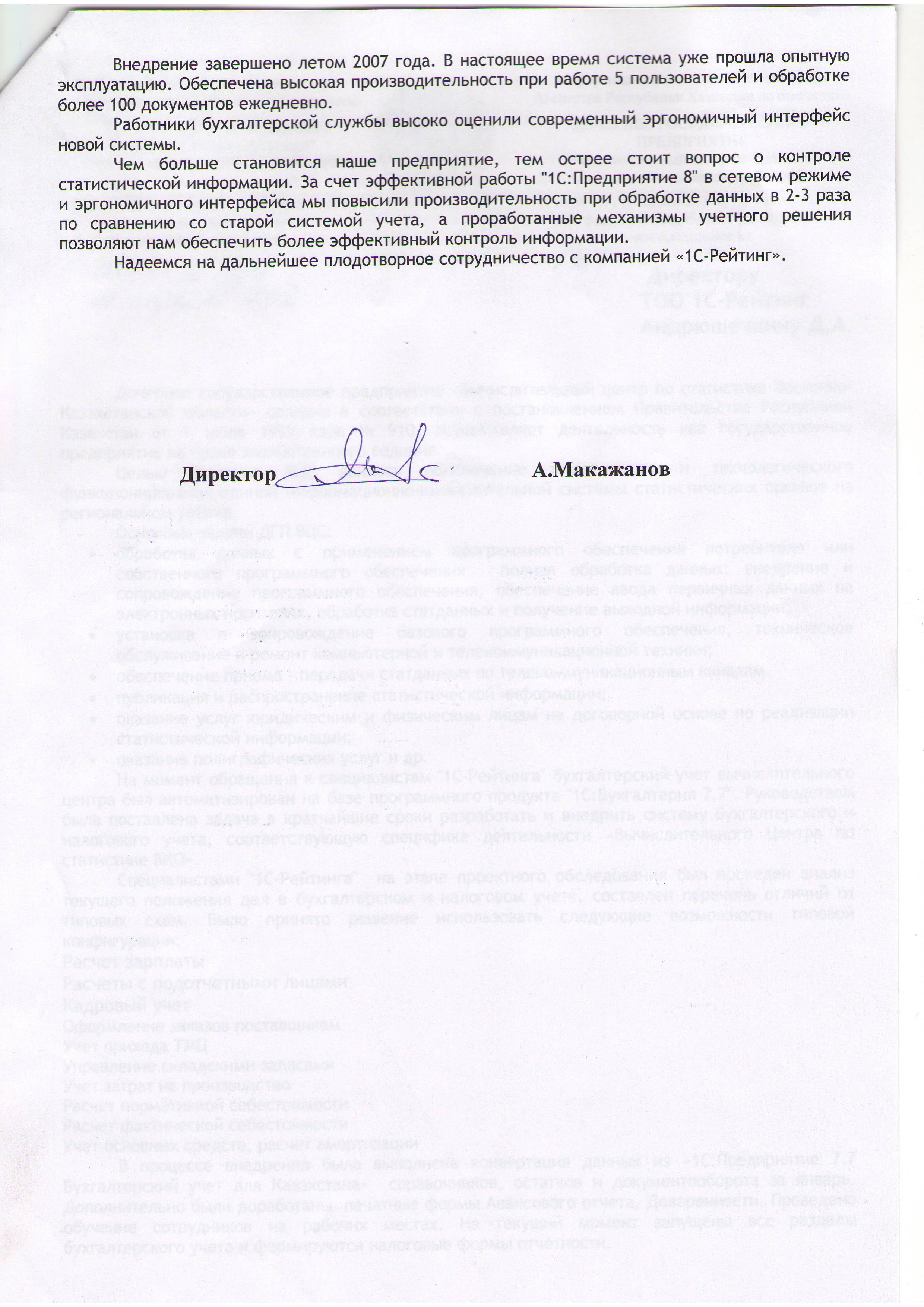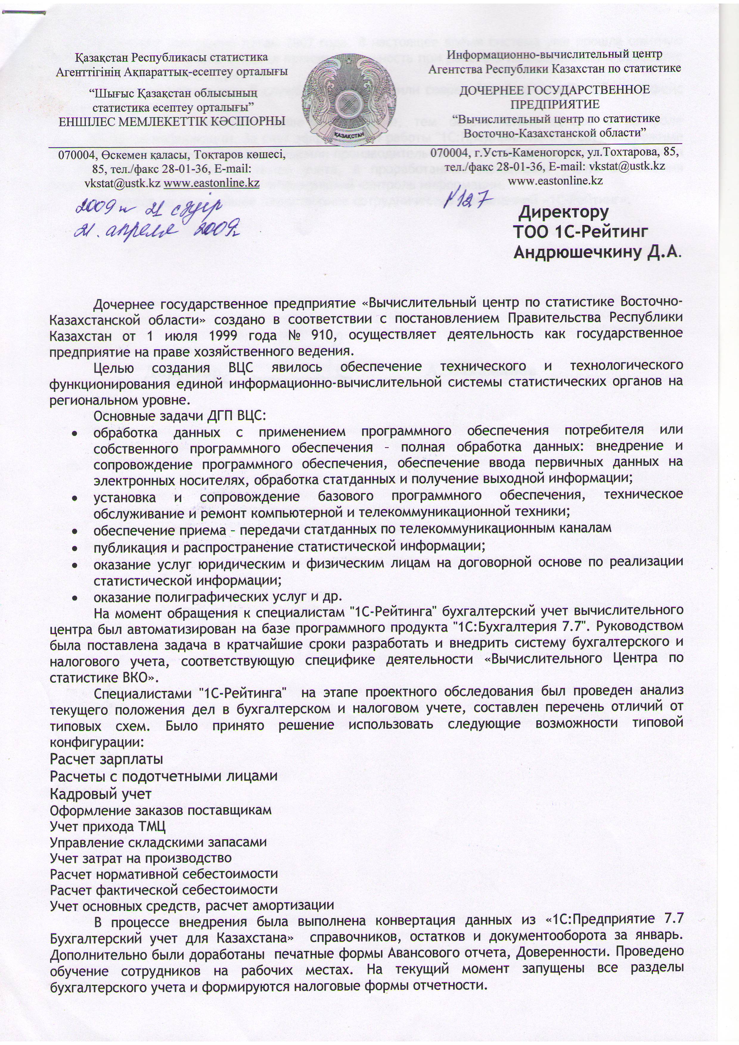 «Вычислительный Центр по статистике ВКО» совместно с компанией «1С-Рейтинг», специализирующейся в области разработки и внедрения информационных систем, запустила в эксплуатацию систему бухгалтерского и налогового учета на базе программного продукта «1С:Бухгалтерия 8 для Казахстана». Внедрение позволило решить ряд важных для предприятия задач: в несколько раз возросла скорость обработки документов, повышен контроль над статистической информацией.