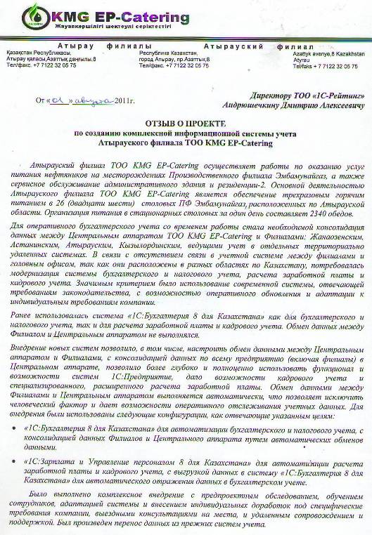 Специалистами компании «1С-Рейтинг» завершен проект по созданию комплексной информационной системы учета Атырауского филиала ТОО «KMG EP-Catering» на базе программных продуктов «1С:Бухгалтерия 8 для Казахстана» и «1С:Зарплата и Управление персоналом 8 для Казахстана».