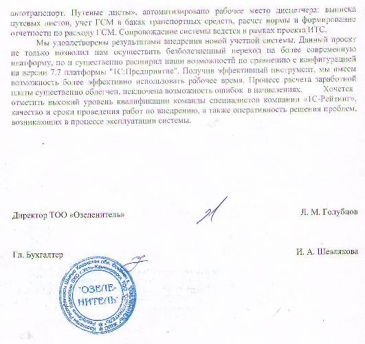 Специалисты компании «1С-Рейтинг» успешно закончили проект комплексной автоматизации ТОО «Озеленитель», предприятия занимающегося озеленением и благоустройством города, с помощью программных продуктов: «1С:Бухгалтерия для Казахстана», «1С:Зарплата и Управление персоналом для Казахстана» и «1С-Рейтинг: Управление затратами на автотранспорт. Путевые листы».