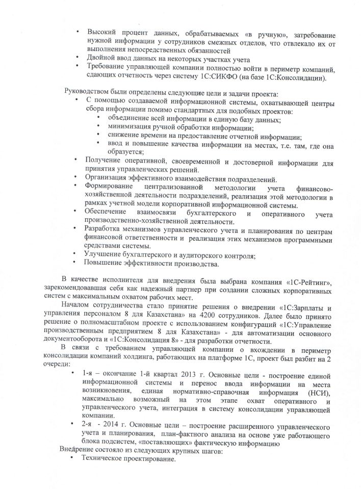 Началом сотрудничества послужило принятие решения о внедрении «1С:Зарплата и управление персоналом 8 для Казахстана» на 4200 сотрудников. Далее было принято решение о полномасштабном проекте с использованием конфигураций: