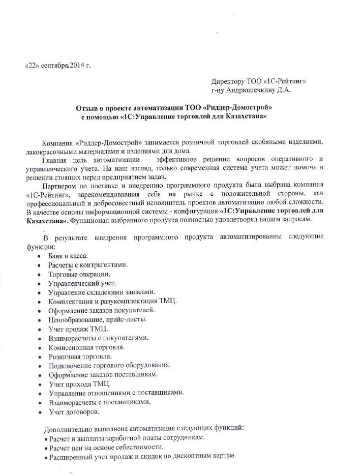 «Качеством установленного программного продукта и профессиональной помощью сотрудников «1С-Рейтинг» довольны. Очень рад тому, что сотрудники избавились от необходимости выполнения многих рутинных операций вручную, как результат, мы получили удобный инструмент для выполнения повседневной работы. Мы можем рекомендовать коллегам использовать данное программное решение для автоматизации деятельности торгового предприятия и благодарим компанию «1С-Рейтинг» за оказанные услуги по его внедрению».