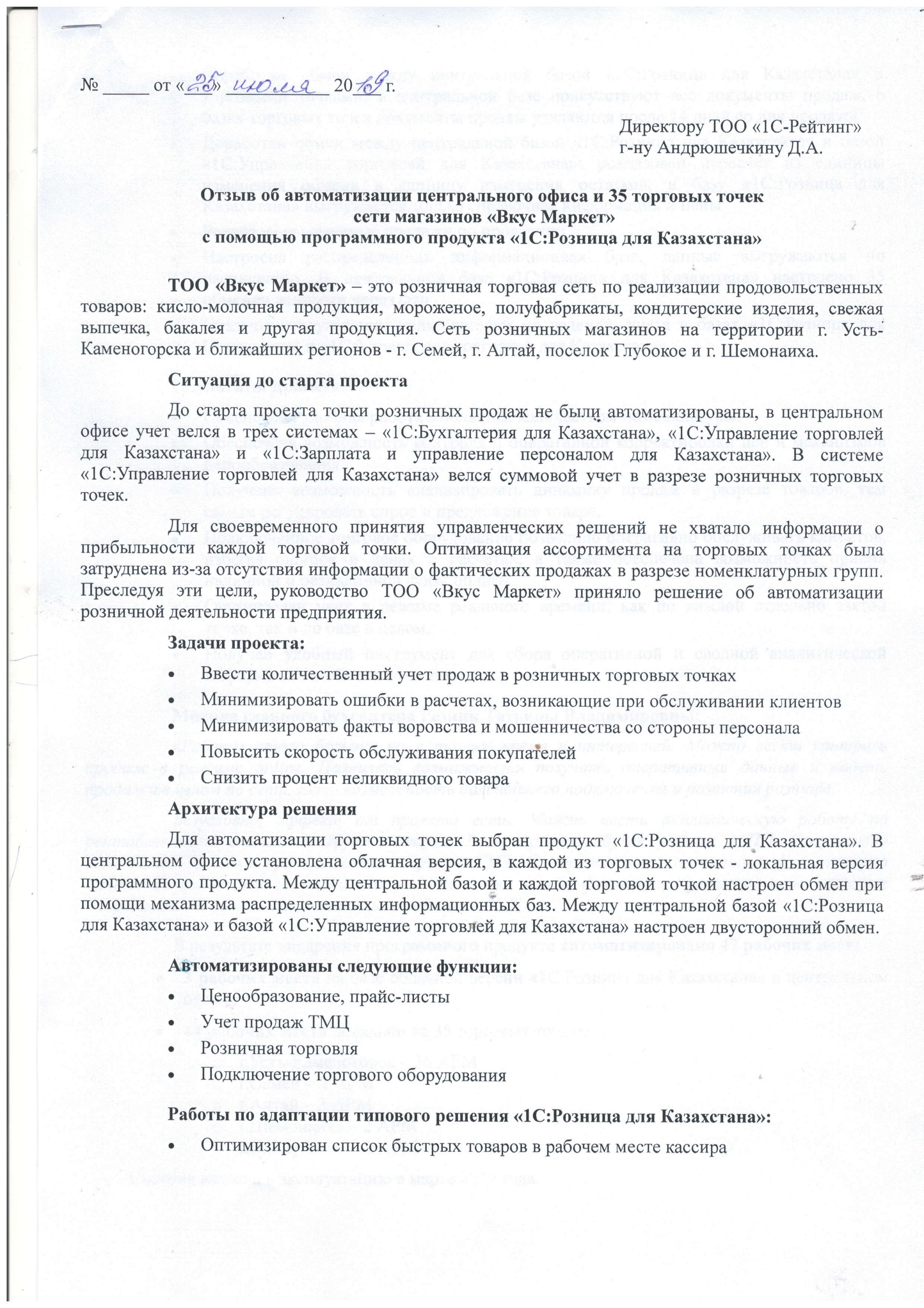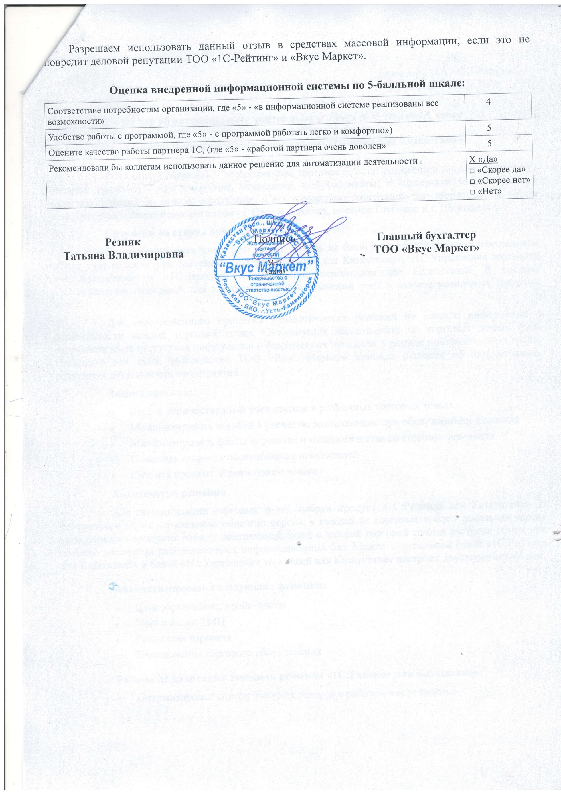 Специалистами компании «1С-Рейтинг» завершен проект автоматизации 35 торговых точек сети магазинов «Вкус Маркет» с помощью программы «1С:Розница для Казахстана».