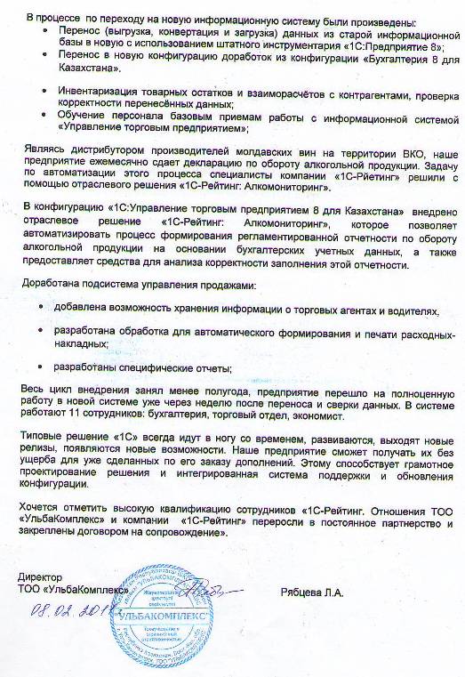 «Типовые решения «1С» всегда идут в ногу со временем, развиваются, выходят новые релизы, появляются новые возможности. ТОО «УльбаКомплекс» сможет получать их без ущерба для уже сделанных по его заказу дополнений. Этому способствует грамотное проектирование решения и интегрированная система поддержки и обновления конфигурации. Хочется отметить высокую квалификацию сотрудников «1С-Рейтинг». Отношения ТОО «УльбаКомплекс» и компании «1С-Рейтинг» переросли в постоянное партнерство и были закреплены договором на сопровождение».