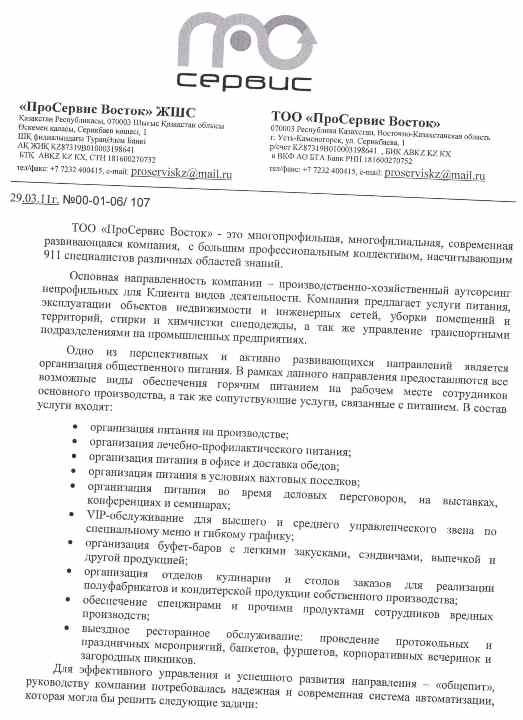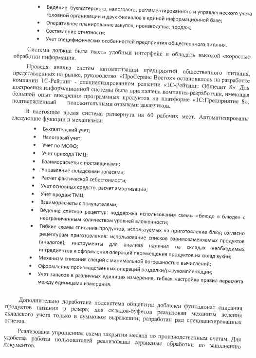 Проведя анализ систем автоматизации предприятий общественного питания, представленных на рынке, руководство «ПроСервис Восток» остановилось на разработке компании «1С-Рейтинг» — специализированном решении «1С-Рейтинг: Общепит для Казахстана». Для построения информационной системы была приглашена компания-разработчик, имеющая большой опыт внедрения программных продуктов на платформе «1С:Предприятие 8», подтвержденный положительными отзывами заказчиков.