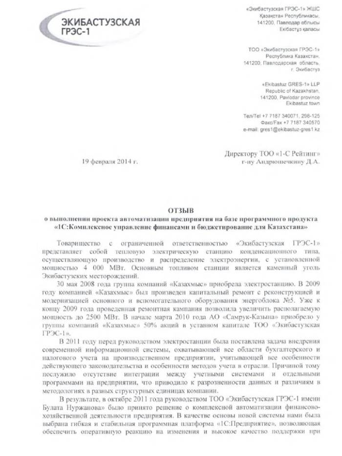 Компания «1С-Рейтинг» успешно завершила проект комплексной автоматизации ТОО «Экибастузская ГРЭС-1». В результате внедрения сокращены сроки подготовки регламентированной отчетности, создана единая для всех подразделений информационная база, снижено время реакции на изменения в законодательстве РК, формирование отчетности выполняется в соответствии с актуальными нормативами, в разы повышена эффективность управления денежными средствами предприятия, повышено качество учета, его детализация.