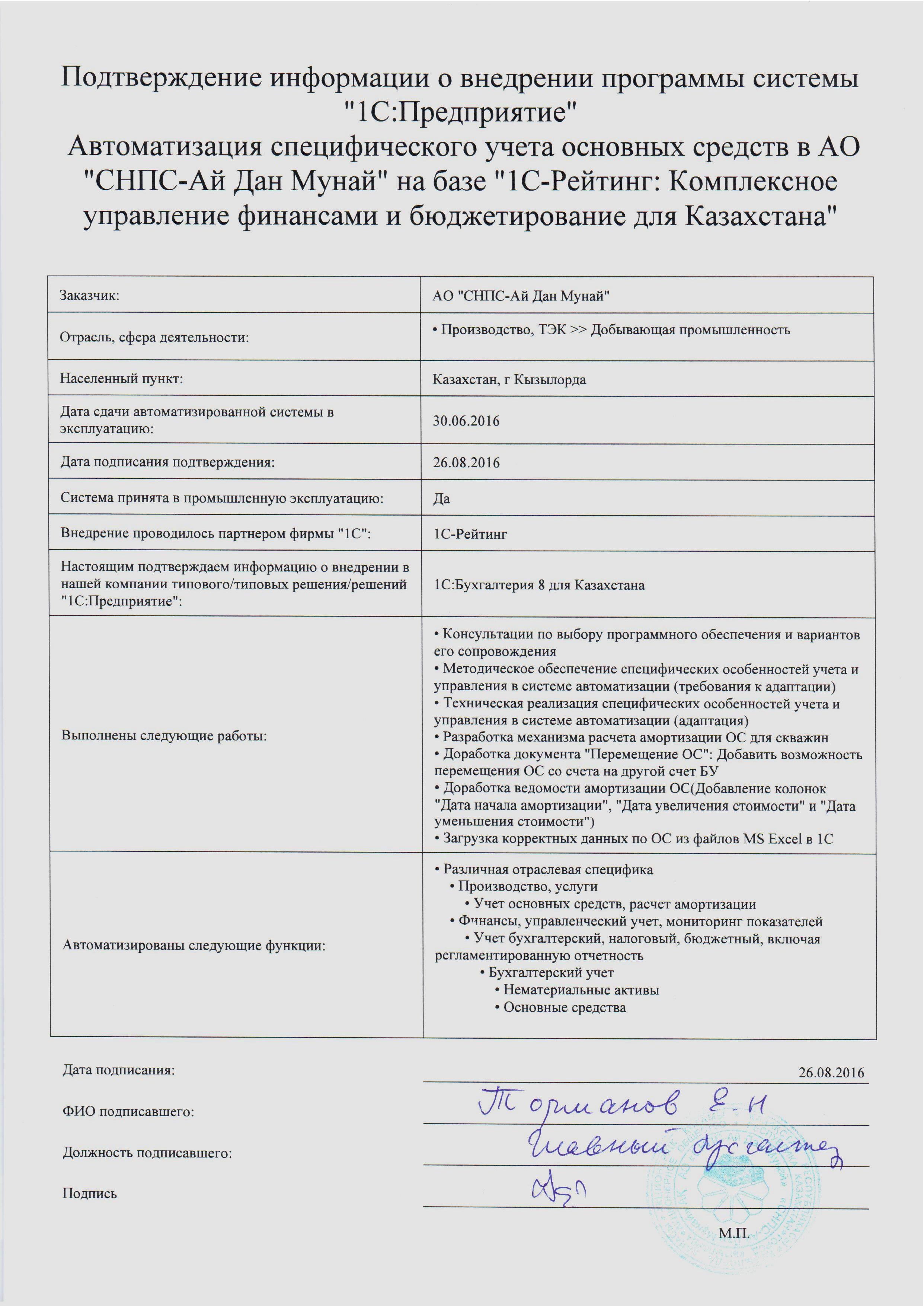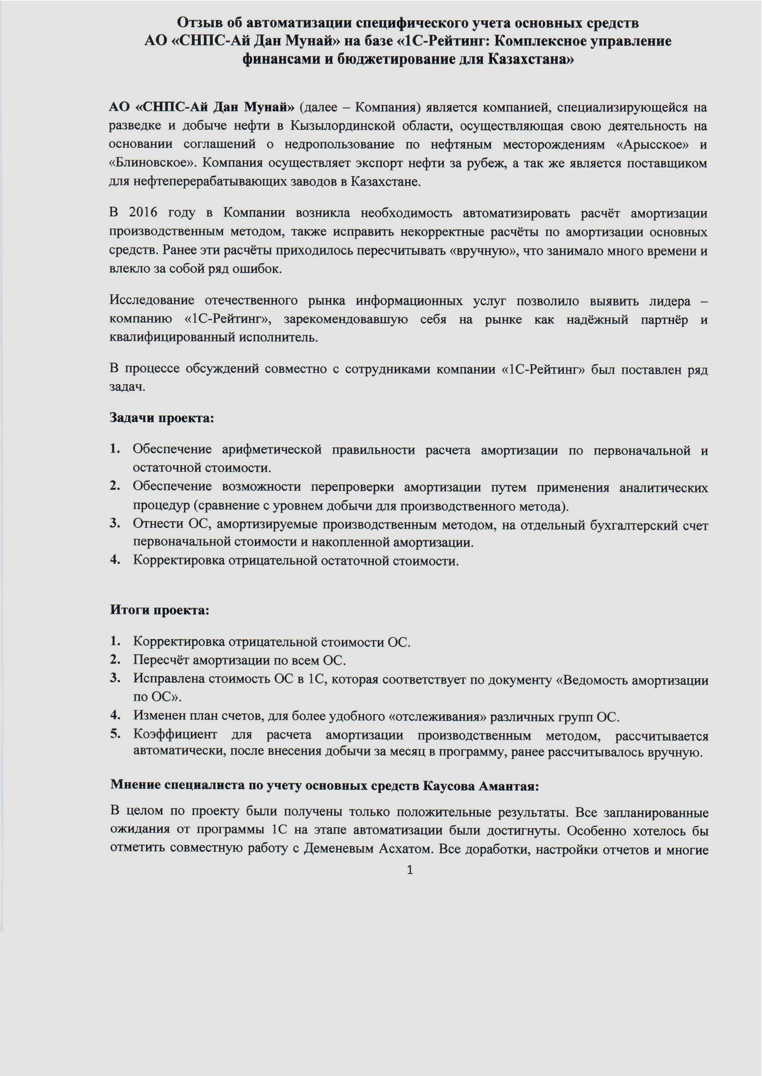 Специалистами компании «1С-Рейтинг» завершён проект автоматизации специфического учёта основных средств АО «СНПС-Ай Дан Мунай» на базе отраслевого решения «1С-Рейтинг: Комплексное управление финансами и бюджетирование для Казахстана».
