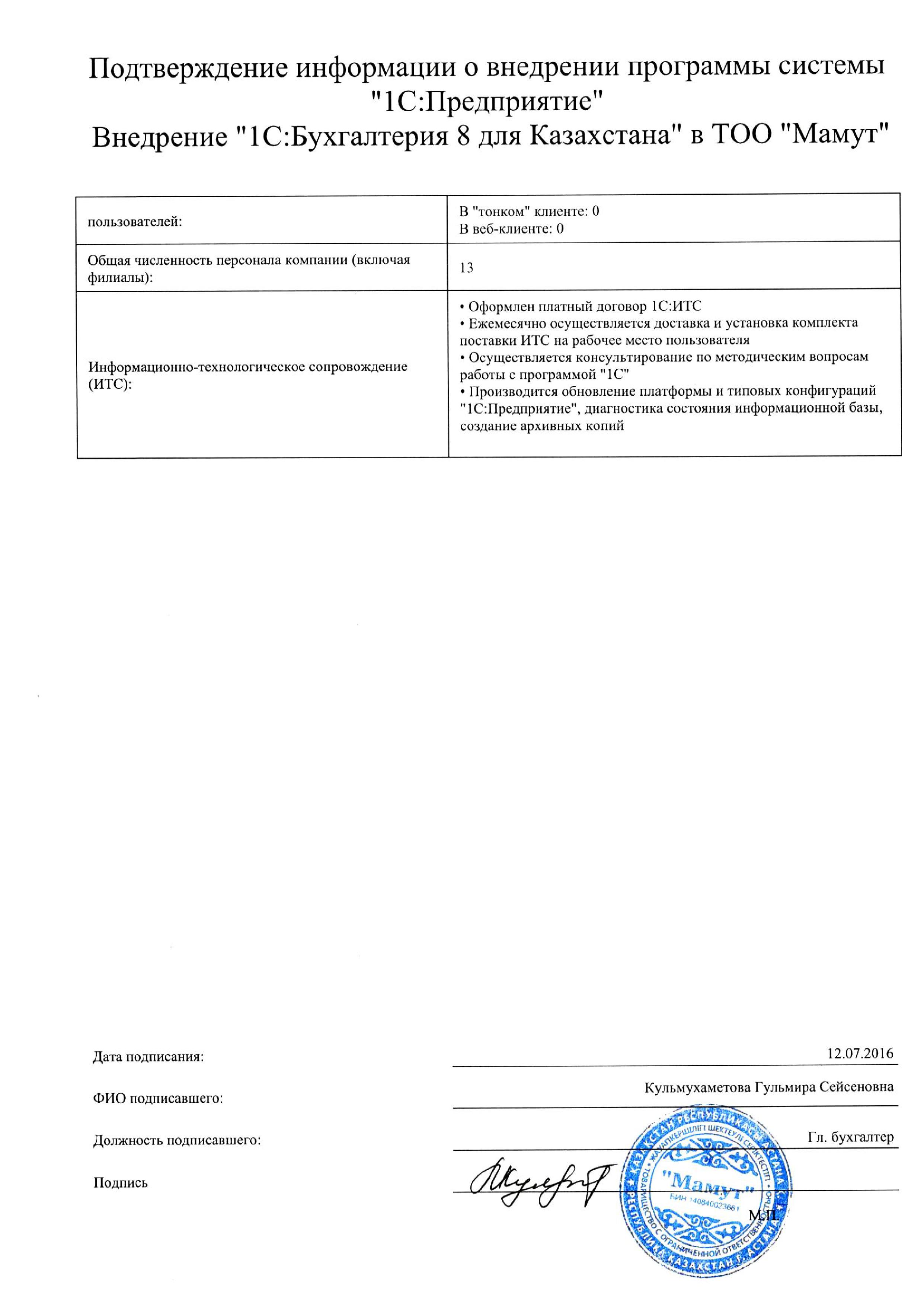 | Внедренное типовое решение: | 1С:Бухгалтерия 8 для Казахстана |