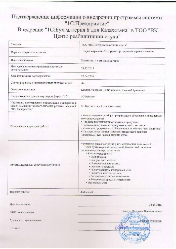 | Внедренное типовое решение: | 1С:Бухгалтерия 8 для Казахстана |