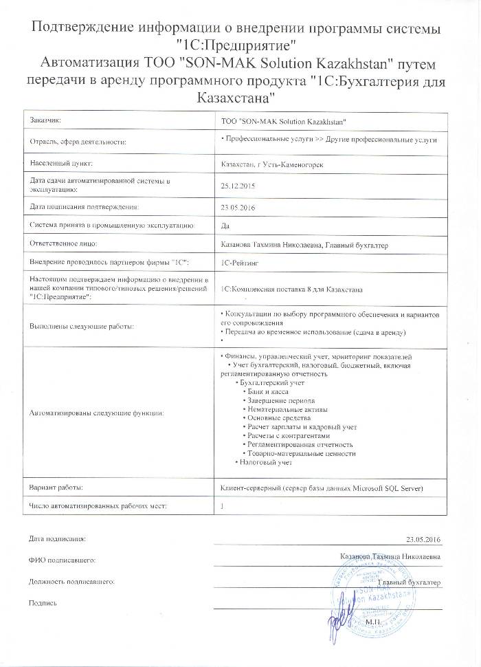 | Арендованное типовое решение: | 1С:Бухгалтерия 8 для Казахстана |