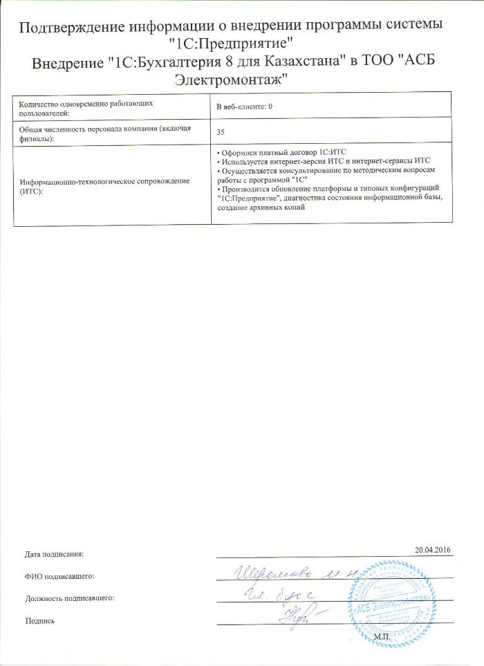 | Внедренное типовое решение: | 1С:Бухгалтерия 8 для Казахстан |