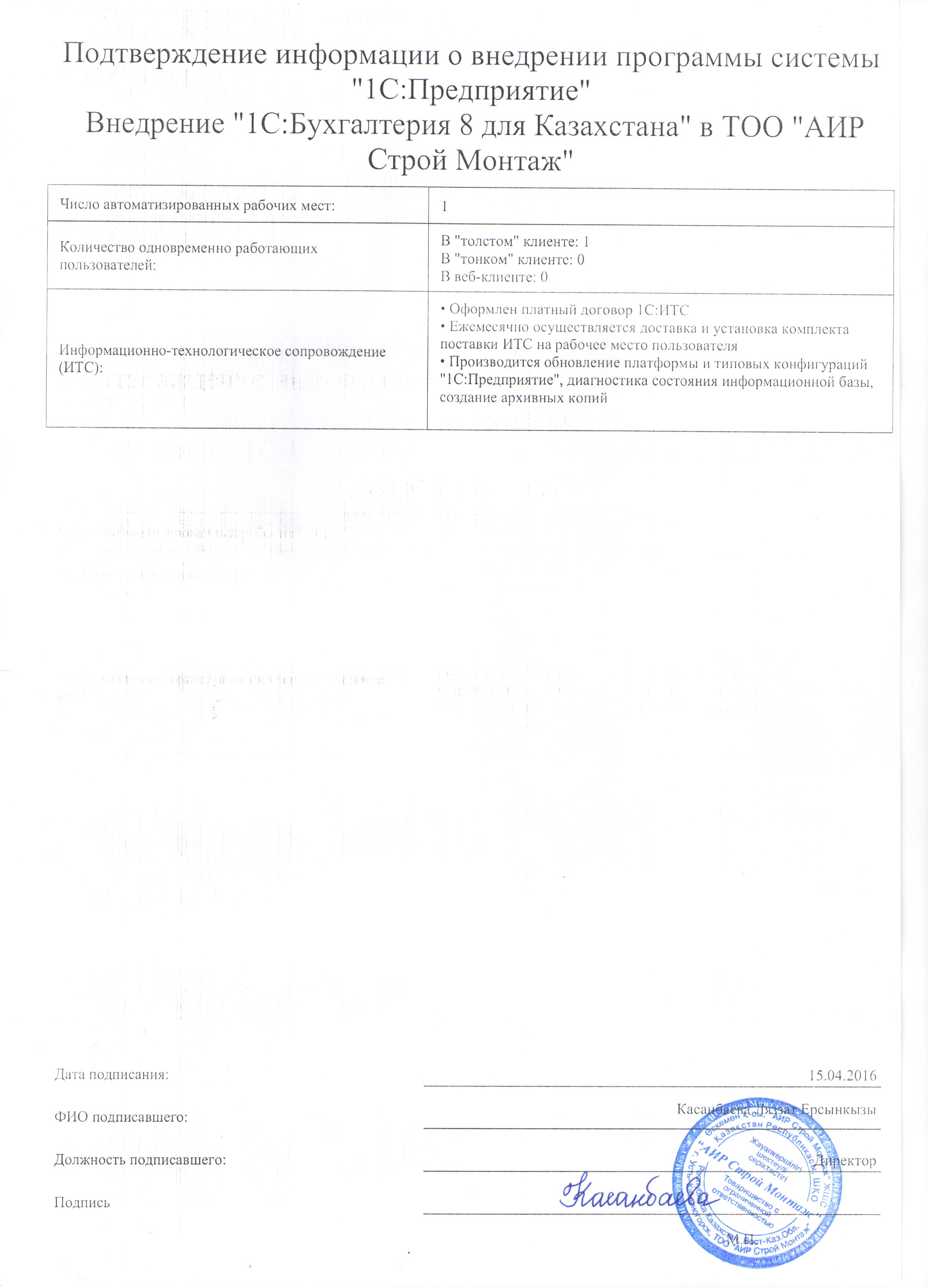| Внедренное типовое решение: | 1С:Бухгалтерия 8 для Казахстана |