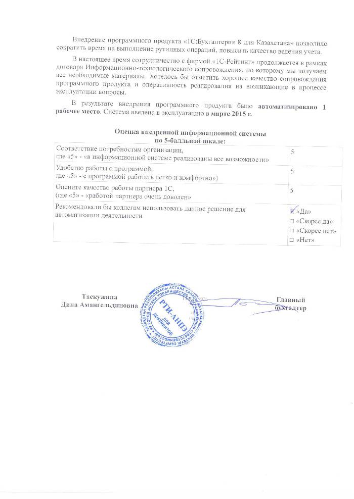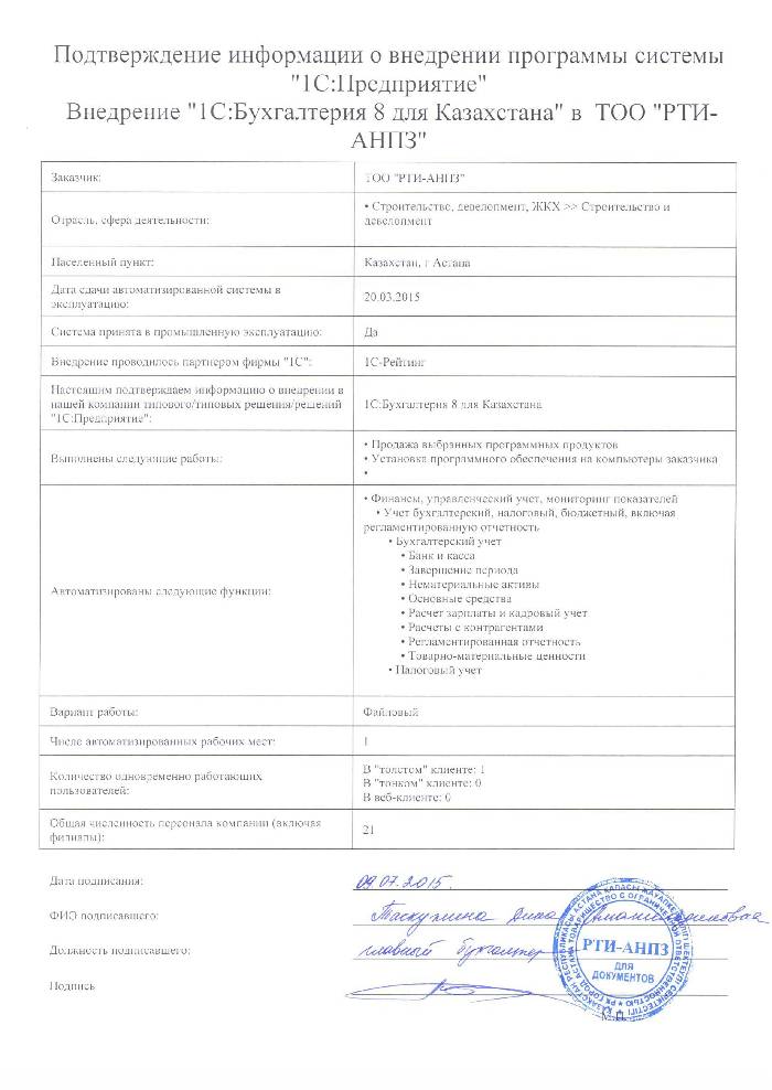 | Внедренное типовое решение: | 1С:Бухгалтерия 8 для Казахстана |