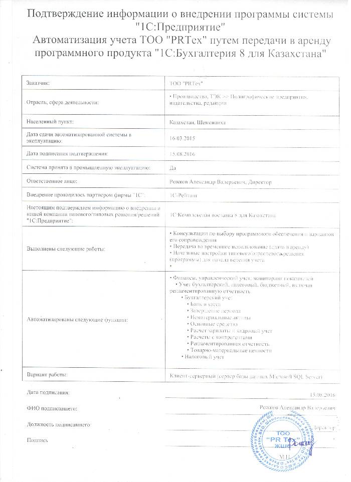 - Ежемесячно производятся работы по обновлению платформы и типовых конфигураций, диагностика состояния информационной базы, создание архивных копий