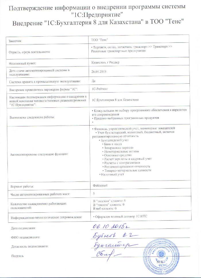 | Внедренное типовое решение: | 1С:Бухгалтерия 8 для Казахстана |